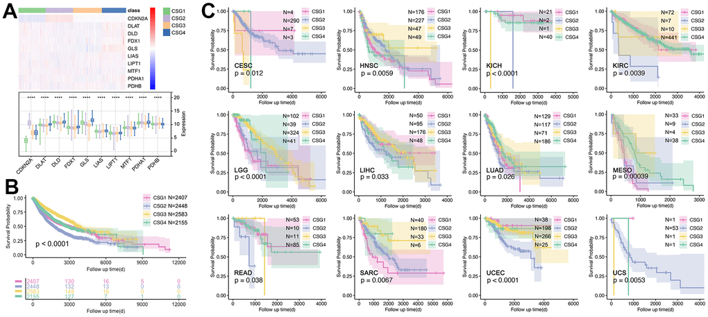Next, the prognosis differences amongst CRGs are explored. As Figure 8A shows, CRGs hold different expressions amongst CRG subgroups, especially for CDKN2A (Figure 8A). Then, we found there is a significant difference in prognosis amongst different CRG subgroups (Figure 8B) in pan-cancer, while the prognosis differences only appeared in 12 single cancer cohorts (CESC, HNSC, KICH, KIRC, LGG, LIHC, LUAD, SO, READ, SARC, UCEC, UCS) (Figure 8C).
