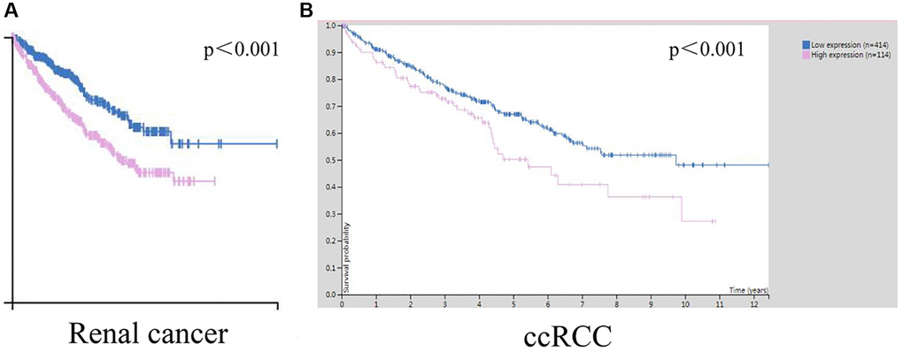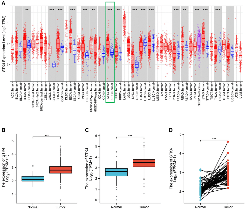 To explore the influence of STK4 on the prognosis of ccRCC patients, Kaplan-Meier plots were used to draw the overall survival (OS) curve. We found that the high expression of STK4 has a significant (p < 0.001) association with renal cancer (including ccRCC) patients’ survival (Figure 4A, 4B), suggesting that STK4 is a reliable prognostic predictor.