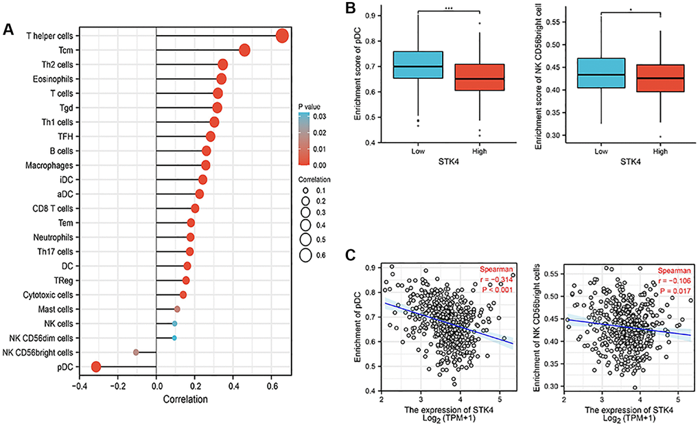 Nowadays, immune cells have been considered a crucial aspect in understanding oncogenesis and cancer progression because of their important role in the tumor microenvironment [17, 18]. Based on the STK4-related functional enrichment analysis above, we also found that STK4 may play roles in immunoregulatory interactions. So, ssGSEA with Spearman R was used to analyze the correlation between the expression of STK4 and immune infiltration. We found that STK4 expression was negatively correlated with plasmacytoid dendritic cells (pDCs) (p < 0.001) and natural killer (NK) CD56 bright cells (p = 0.017), while STK4 expression was positively correlated with several immune cells including T helper cells, Tcm, Th2 cells and so on (Figure 6). Therefore, we infer that STK4 may regulate immune infiltration and play a role in the development of ccRCC by affecting NK and pDCs cells.