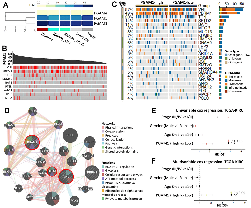 We first conducted an analysis of the expression levels of PGAM family genes in the male reproductive system and observed that PGAM1 exhibited higher expression in male reproductive organs of fat fruits (Figure 1A). We subsequently explored the association of PGAM1 mutations with common cancer progression genes, such as VHL, PBRM1, and SETD2 (Figure 1B). Subsequently, we conducted an analysis in which we extracted data pertaining to PGAM1 expression from the TCGA database, focusing on patients diagnosed with Kidney Renal Clear Cell Carcinoma (KIRC). This information was presented using a waterfall plot, offering a visual representation of the top 25 genes that exhibited notable alterations in response to PGAM1 expression changes. This analysis delved into the genetic variations that occur at different levels of PGAM1 expression and their connections with genes that are frequently found to be mutated in KIRC. The insights gained from this examination are depicted graphically in Figure 1C, providing a comprehensive view of these associations and their potential implications in the context of KIRC. The mutation landscape identified various types of mutations, including splice site, missense, frameshift, and nonsense mutations, as well as in-frame ins/dels. Moreover, we used protein-protein interactions to evaluate regulatory network maps and inferred underlying mechanisms. Our analysis revealed that PGAM1 was associated with VHL, which was consistent with the results from Figure 1C. Furthermore, we found that the intermediate factor connecting these two genes was HIF1A (Figure 1D). We conducted univariate and multivariate Cox regression analyses to evaluate the association of PGAM1 expression with OS. Our findings indicated that stage, sex, age, and PGAM1 (high vs low) were significantly associated with OS (Figure 1E). Finally, we applied multivariate Cox regression analysis to the same variables and found that the risk score could serve as an independent prognostic factor (P < 0.05) (Figure 1F).