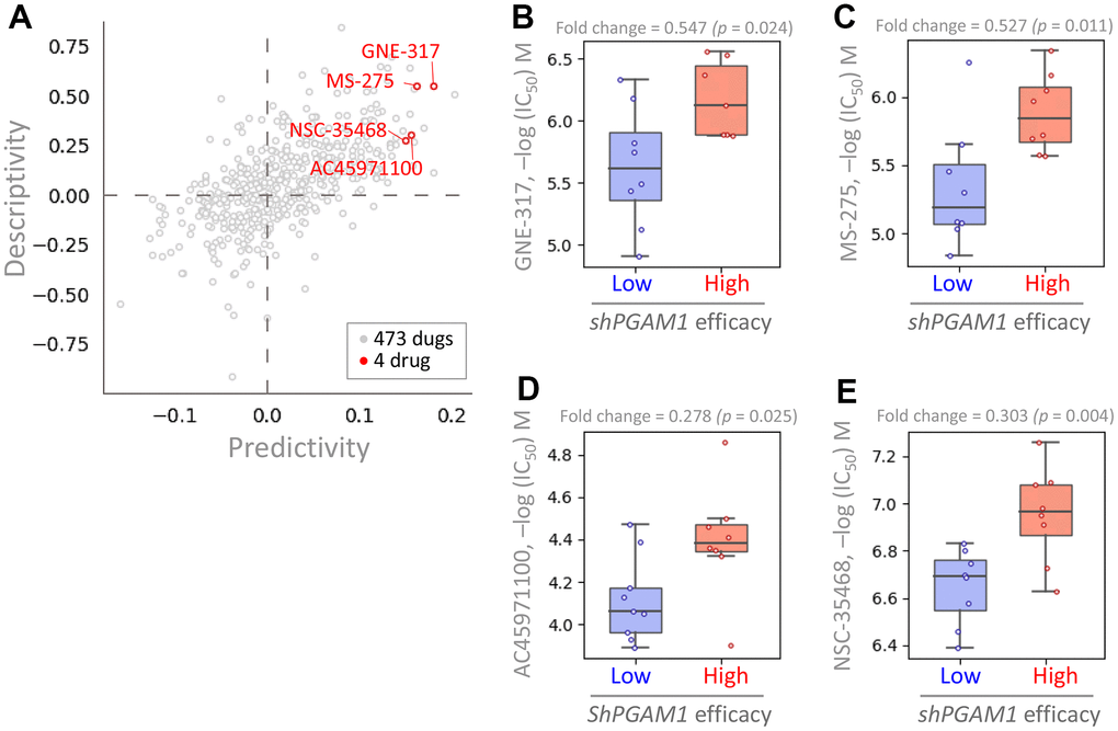 In this study, we aimed to identify drugs with potential efficacy against KIRC by analyzing the GDSC repository for drugs that exhibit enhanced potency in the presence of high PGAM1 expression. We performed a cross-correlation analysis to investigate the effects of 473 drugs on shRNA-mediated PGAM1 in various KIRC cells. Our analysis identified four drugs, namely GNE-317, MS-275, AC45971100, and NSC-35468, that displayed altered potency (Figure 10A). Notably, KIRC cell lines with high shPGAM1 efficiency exhibited increased sensitivity to these drugs (Figure 10B–10E). Collectively, these findings suggest that GNE-317, MS-275, AC45971100, and NSC-35468 hold potential as anticancer agents targeting PGAM1 to regulate KIRC growth.