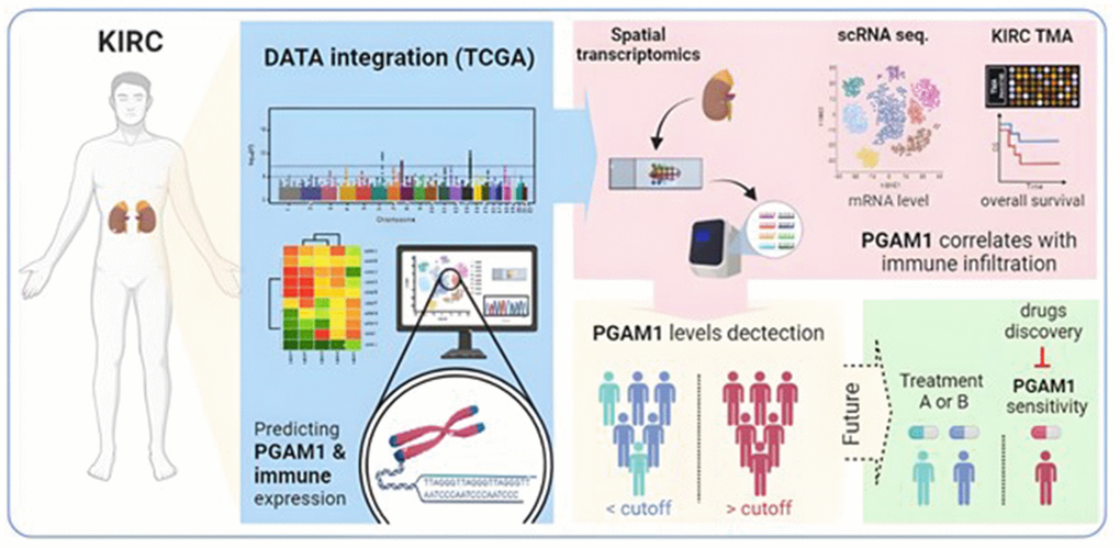 The aim of our study was to explore the theragnostic potential of PGAM1 in KIRC through an integrated analysis. This included analyzing differential gene expression, protein correlation, pathway analysis, and prognostic analysis across various tumor types and stages. We also examined the correlation of PGAM1 expression with immune-infiltrating cells and immunomodulatory factors. Our findings indicate that PGAM1 could serve as a strong prognostic biomarker and is closely associated with immune mechanisms, highlighting its potential as an immunotherapeutic agent for KIRC.