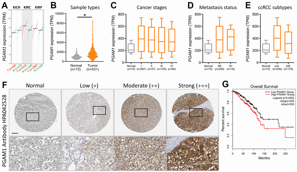 Subsequently, we conducted a comprehensive assessment of various kidney cancers and discovered that the levels of phosphoglycerate mutase-1 (PGAM1) were elevated in both clear cell renal cell carcinoma (KIRC) and papillary renal cell carcinoma (KIRP) but reduced in chromophobe renal cell carcinoma (KICH) (Figure 2A). Upon scrutinizing the expression of PGAM1 across diverse sample types, cancer stages, metastasis stages, and ccRCC subtypes in The Cancer Genome Atlas (TCGA) (Figure 2B–2E), we observed that PGAM1 expression was significantly amplified in the first stage of metastatic KIRC, and both subtypes of ccRCC exhibited an upward trend. Furthermore, analysis of immunohistochemical staining data from the Human Protein Atlas verified that the PGAM1 protein was upregulated in KIRC tumor tissues relative to normal tissues (Figure 2F). Strikingly, Kaplan-Meier analysis revealed that patients with elevated PGAM1 immunohistochemical scores had a shorter overall survival time (Figure 2G), underscoring the potential clinical significance of PGAM1 in ccRCC.