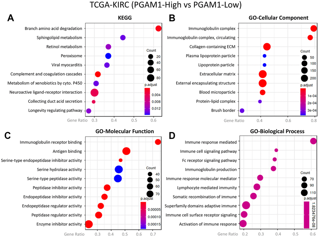 In light of the role of the tumor immune microenvironment (TIME) in promoting kidney damage and recruiting immune cells, we further investigated the relationship between metabolism and the immune response in tumors. Our analysis showed that overexpression of PGAM1 resulted in Branch amino acid degradation, as reflected in the KEGG pathway analysis (Figure 4A). Moreover, the activation of the Immunoglobulin complex was observed in the GO-cellular component analysis (Figure 4B), and the same result was reflected in the GO-molecular function analysis, where the ratio of Immunoglobulin receptor binding and Immune response-mediated biological function was greatly increased (Figure 4C, 4D). Based on these findings, we hypothesize that kidney damage, which requires high energy, not only leads to metabolic conversion and abnormality but also promotes infiltration of immune cells, playing a significant role in the tumor immune microenvironment. The activation of the Immunoglobulin complex and increased Immunoglobulin receptor binding observed in our analysis suggests that immune cells may be recruited to the damaged kidney, contributing to the immune response in tumors.