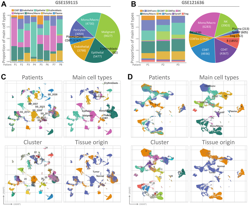 Single-cell RNA sequencing (scRNA-seq) has emerged as a powerful tool to explore cellular heterogeneity and gene expression at the single-cell level. In this study, scRNA-seq data were obtained from the GSE159115 and GSE121636 datasets of the GEO database. Quality control (QC) was performed using the R package Seurat to ensure the inclusion of high-quality cells and reduce the influence of batch effects. To identify distinct cell subpopulations, uniform manifold approximation and projection (UMAP) clustering was performed using the “BiocManager” and Gene Set Variation Analysis (“GSVA”) packages in R. Cell type annotation was performed by comparing the expression profiles of previously recognized cellular marker genes with those of the identified cell subpopulations using the “SingleR” package in R. The association between gene expression and immune cell infiltration/abundance was explored using the “Gene” module of TIMER, focusing on macrophages, dendritic cells (DC), and CD4+ T, CD8+ T, and B cells. Finally, the association between immune infiltration and overall survival of KIRC patients was estimated using several algorithms, including TIMER, EPIC, MCPCOUNTER, CIBERSORT, CIBERSORT-ABS, QUANTISEQ, and XCELL.