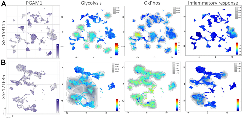 To assess the transcriptome of PGAM1 in renal cancer at the single-cell level and to explore the heterogeneity of different cell types in the renal cancer microenvironment, we conducted an analysis of two publicly available single-cell RNA-sequencing databases (GSE159115 and GSE121636). A total of 8 samples from GSE159115, comprising 8 types of cells and 32 clusters, and 3 samples from GSE121636, comprising 10 cells and 21 clusters, were included in the study. Using UMAP plots, we identified and visualized 8 and 10 major cell populations in GSE159115 and GSE121636, respectively (Figure 5A, 5B). After quality control and batch effect removal, we analyzed 27,669 (GSE159115) and 25,681 (GSE121636) cells, respectively. We determined cell type-specific markers for each cluster based on the top-ranked differentially expressed genes, which were used for cell type classification. Figure 5C, 5D shows the clinical information for each cell population, where differences in the corresponding proportions of each cluster were observed for different clinical characteristics. We further analyzed the expression and distribution of PGAM1 in these two single-cell sequencing databases. As shown in Figure 6A, 6B, we found that PGAM1 expression levels in different cell types of renal cancer were high in the same region as the high glycolysis model. In addition, oxidative phosphorylation in Figure 6B was generally increased, which was also reflected in the Inflammatory response.