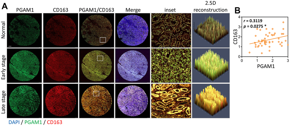 We employed a method that has been described previously, which is summarized as follows [18]. Immunofluorescence analysis was performed by fixing the tissue with 4% paraformaldehyde at room temperature for 10 minutes, permeabilizing it with 0.2% Triton X-100 for 5 minutes, blocking it with 5% BSA for 30 minutes, and incubating it overnight at 4° C with the specified primary antibodies PGAM1_A4170 and CD163_A22619 purchased from Abclonal (Woburn, MA, USA). After washing with PBST, the samples were incubated with secondary antibodies for 30 minutes at room temperature. The BX61VS® Fully Motorized Fluorescence Microscope (Olympus Corporation, Tokyo, Japan) at ×20 magnification was used to digitize all glass slides with high precision. The whole-slide images were viewed and analyzed with Olympus VS-ASW® software at Li-Tzung Pathology Laboratory (Kaohsiung, Taiwan).