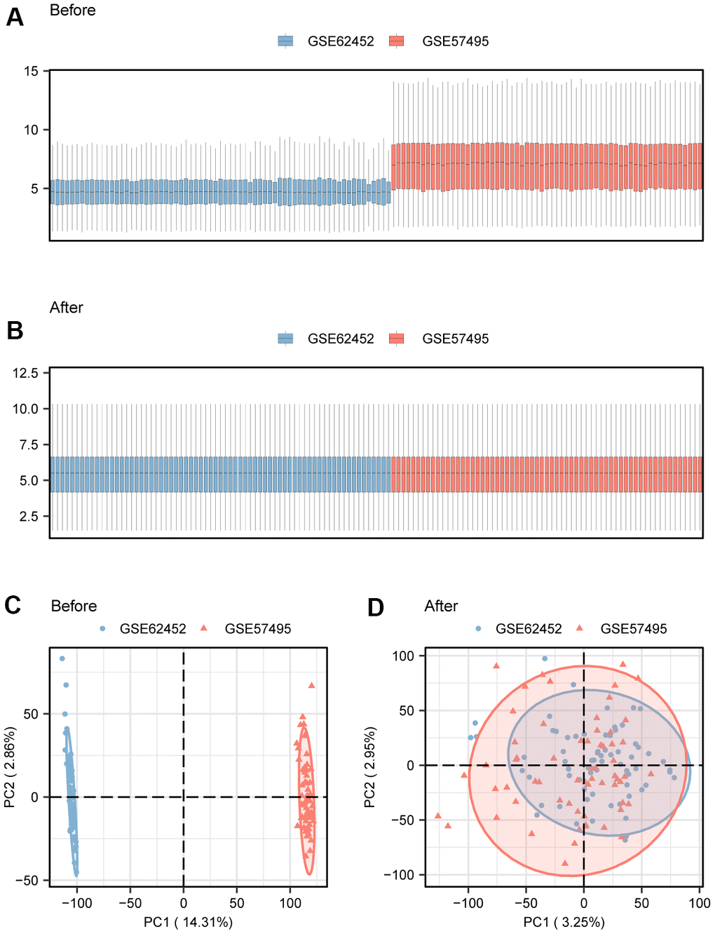 The gene expression matrix of GSE62452 and GSE57495 datasets from GEO was firstly background corrected and data normalized. We obtained Dataset-PAAD using the sva R package to remove batch effects of the combined two datasets. We also compared the datasets before and after the removal of batch effects through distribution Boxplot (Figure 1A, 1B) and Principal Component Analysis (PCA) (Figure 1C, 1D). The results indicated that the batch effect of Dataset-PAAD samples was eliminated after processing.