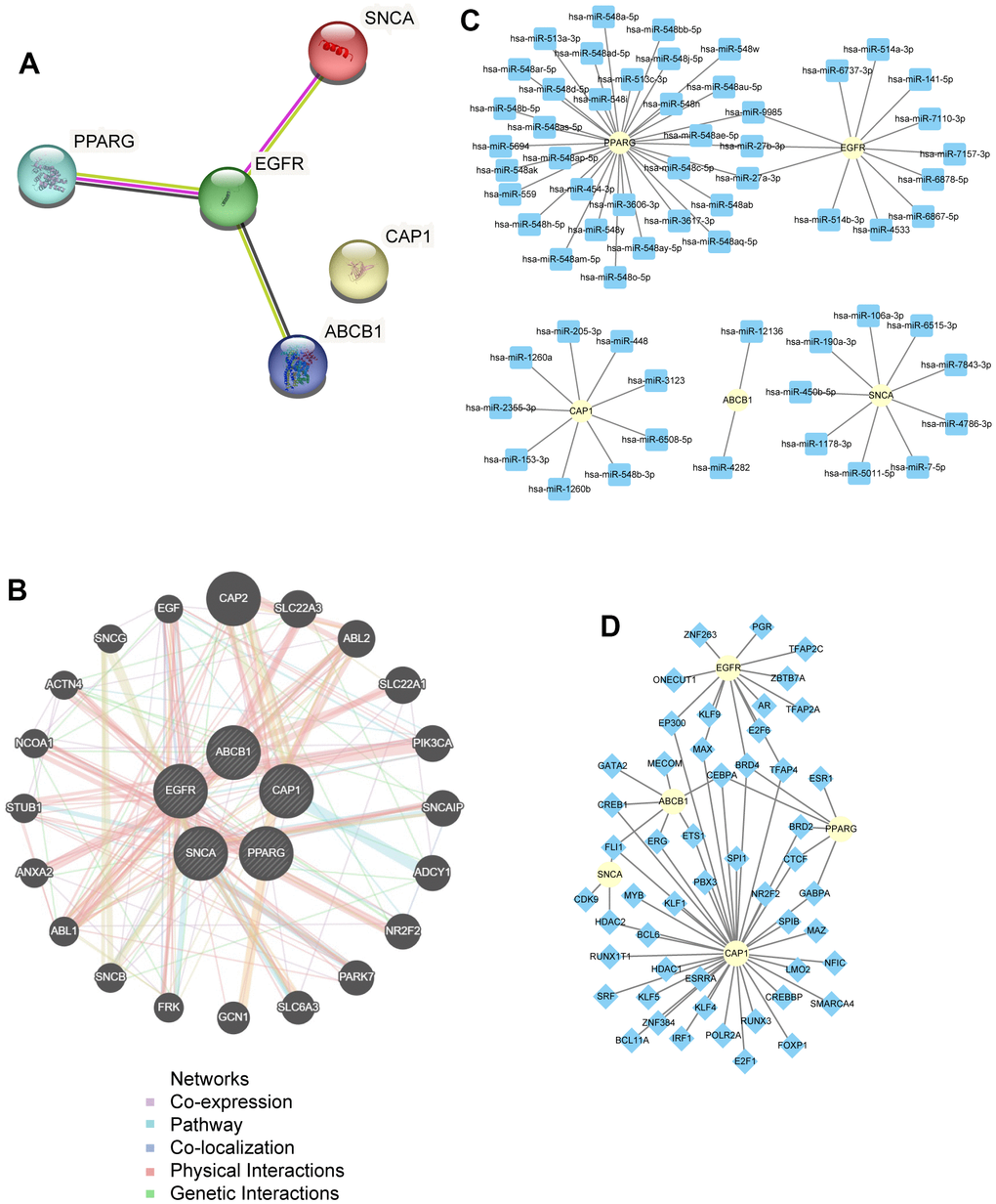 Trizol reagent (Invitrogen, Carlsbad, CA, U.S.A.) was used to extract total RNA from the cells according to the manufacturer’s protocol. Superscript II reverse transcriptase and random primers were used to synthesize cDNA. Quantitative real-time PCR (qRT-PCR) was conducted on the ABI 7900HT Sequence Detection System with SYBR-Green dye (Applied Biosystems, Foster City, CA, U.S.A.). All primers were as following: GAPDH Forward: 5′-GGACCTGACCTGCCGTCTAG-3′, Reverse: 5′-GTAGCCCAGGATGCCCTTGA-3′, ABCB1: Forward: 5′-CCCATCATTGCAATAGCAGG-3′and Reverse: 5′-GTTCAAACTTCTGCTCCTGA-3′, CAP1: Forward: 5′-GAAGGTGAAGGT CGGAGTC-3′and Reverse: 5′-CCCGAATCACATTCTCCAAGA A-3′, EGFR: Forward: 5′-GGACGACGTGGTGGATGC-3′and Reverse: 5′-GGCGCCTGTGGGGTCTGAGC-3′, PPARG: Forward: 5′- ACCAAAGTGCAATCAAAGTGGA-3′and Reverse: 5′- ATGAGGGAGTTGGAAGGCTCT-3′, SNCA: Forward: 5′- AAGAGGGTGTTCTCTATGTAGGC-3′ and Reverse: 5′- GCTCCTCCAACATTTGTCACTT-3′. The reaction parameters included a denaturation program (10 min at 95° C), followed by an amplification and quantification program over 45 cycles (15 s at 95° C and 34 s at 60° C). Each sample was tested in triplicates, and each sample underwent a melting curve analysis to check for the specificity of amplification. The expression level was determined as a ratio between the hub genes and the internal control GAPDH in the same mRNA sample and calculated by the comparative CT method. Expression levels of hub genes were calculated by the 2−δδCt method.