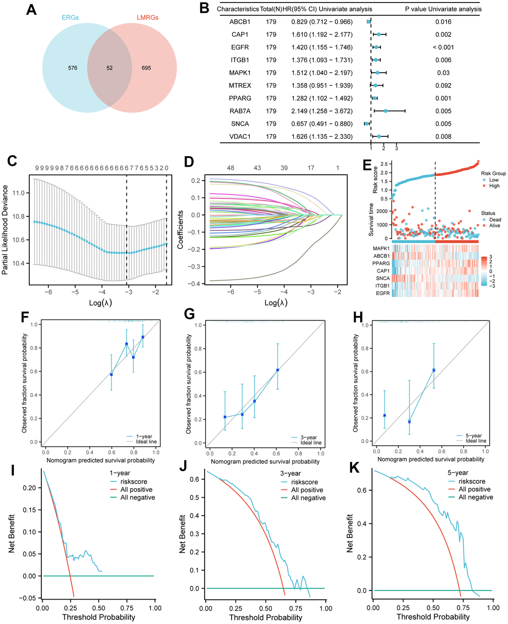 We obtained 52 EALMRGs by intersecting 628 ERGs and 747 LMRGs (Figure 2A). A total of 10 prognosis-related EALMRGs were obtained using univariate Cox regression analysis with P < 0.1 in EALMRGs from TCGA-PAAD, including ABCB1, CAP1, EGFR, ITGB1, MAPK1, MTREX, PPARG, RAB7A, SNCA, VDAC1 (Table 2), and forest plot was drawn to show the results (Figure 2B). We used LASSO regression analysis to construct a LASSO prognostic model based on the expression of these 10 genes. The optimal lambda value for the evaluation index corresponds to 7 genes with non-zero coefficients (Figure 2C), and a LASSO prognostic variable trajectory map was drawn (Figure 2D). These 7 genes were identified as key genes, including ABCB1, CAP1, EGFR, ITGB1, MAPK1, PPARG, and SNCA. We also visualized the high and low expression in the LASSO prognostic model with risk score, consisting of 3 parts, including risk group, survival outcomes, and heatmap (Figure 2E).