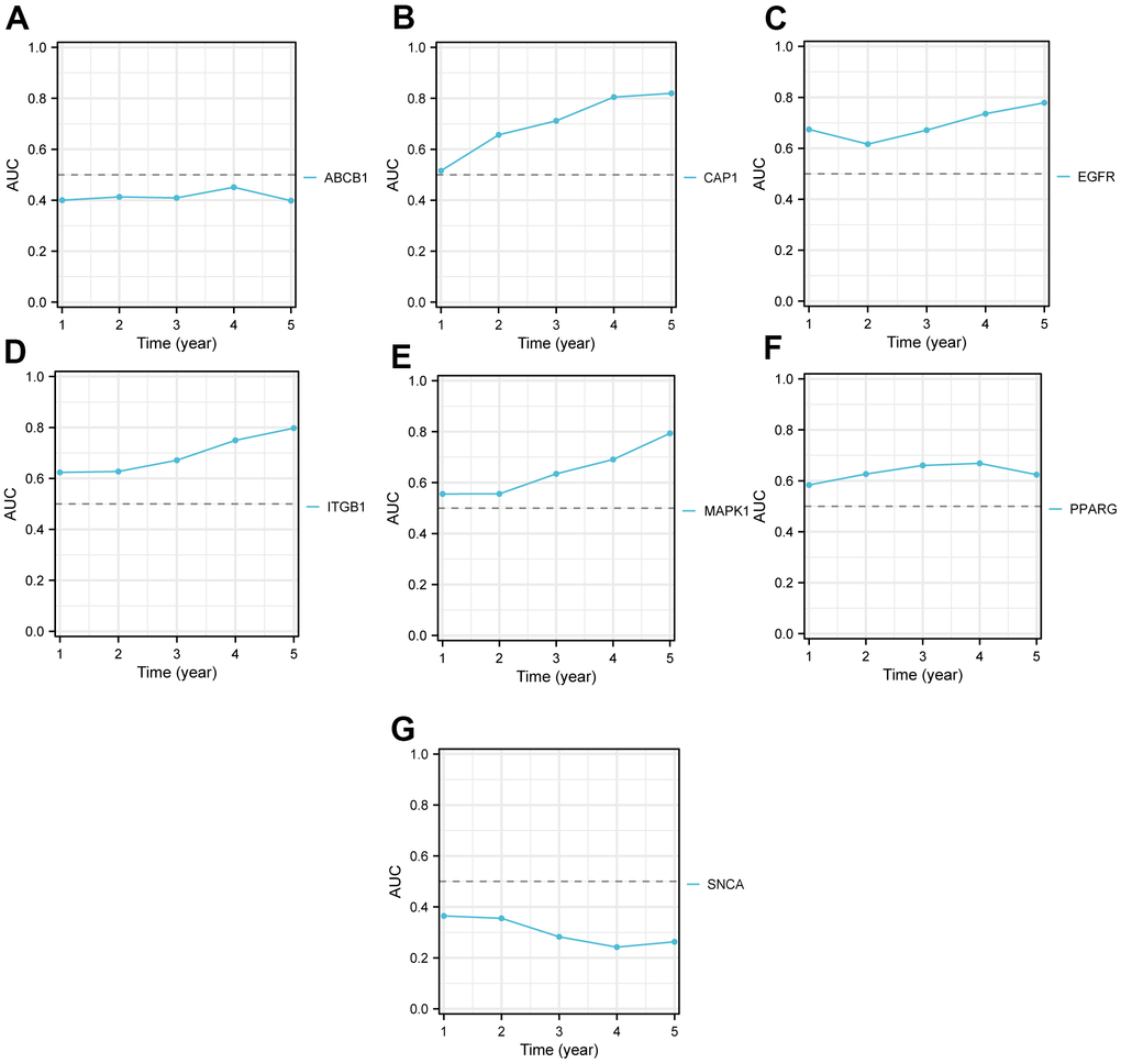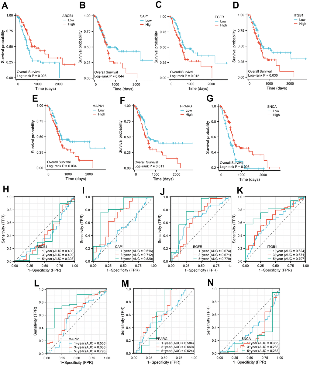 Furthermore, according to these 7 key genes (ABCB1, CAP1, EGFR, ITGB1, MAPK1, PPARG, SNCA), we plotted the KM curves to show the survival state of high and low expression groups in tumor samples from the TCGA-PAAD dataset. The result of KM curves suggested that the survival rate of PAAD patients in the high-expression group of genes ABCB1 and SNCA was higher than that in the low-expression group over time, while the survival rate of PAAD patients in the high-expression group of CAP1, EGFR, ITGB1, MAPK1, PPARG was lower than that in the low-expression group over time (Figure 3A–3G). We also plotted time ROC curves of high and low gene expression groups (Figure 3H–3N) and the trend of AUC of 7 key genes and prognostic models over time (Figure 4A–4G). All 7 genes performed well in predicting the prognosis of PAAD patients at 5-year, with EGFR and ITGB1 having better overall predictive effects than other genes with certain accuracy in LASSO models.