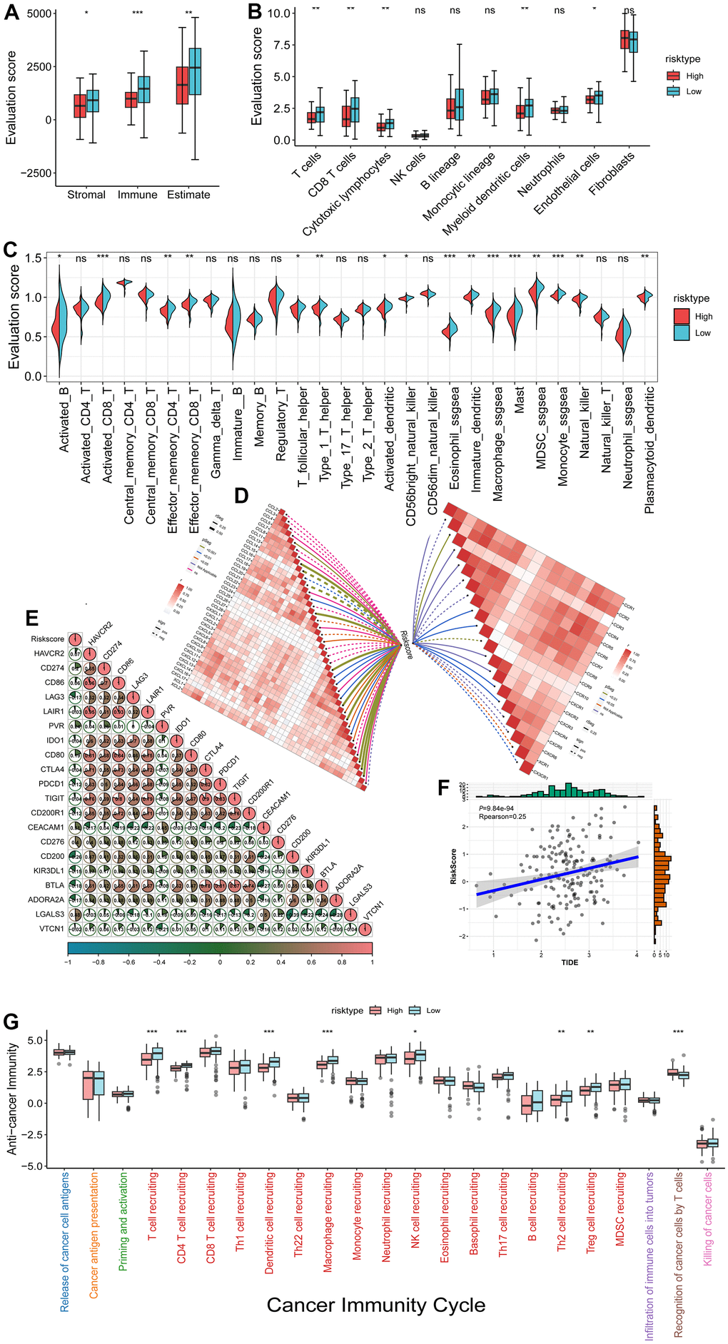 More profoundly, to examine the differences in immune stages, we used the TIP analysis tumor immune phenotype (TIP) database (http://biocc.hrbmu.edu.cn/TIP), a web-based tool that can evaluate the immune microenvironment based on the cancer immune cycle. We calculated the scores for each of the seven steps of the immune cycle in each sample (one step for each color from left to right) and found a higher immune step score (Figure 6G) in the low-risk group.