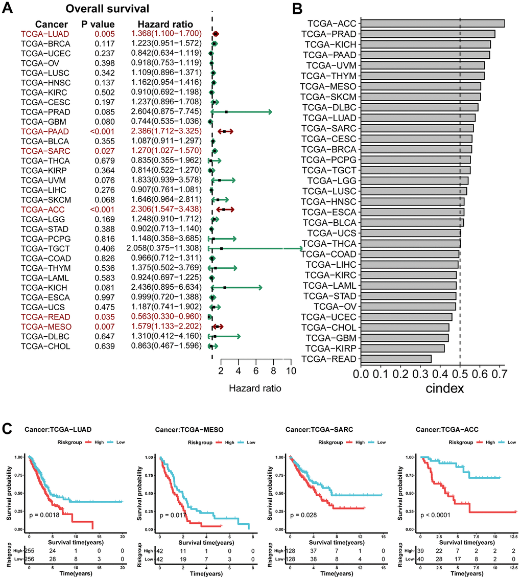 We evaluated the model on 33 pan-cancer data, and through univariate cox analysis, we found that it was significant in 5 datasets other than PAAD, and as a risk prognostic factor in 4 datasets (Figure 7A). Simultaneously, a favorable C-index (Figure 7B) was shown in multiple datasets. Subsequently, K-M plot was plotted for these four datasets, and patients in the high-risk group also have poorer prognoses in multiple cancers (Figure 7C). Moreover, we used the GSVA package to perform a pathway enrichment score on the pan-cancer dataset for the pathways in KEGG. Subsequently, correlation analysis was conducted based on their respective risk scores to screen for pathways (P-value < 0.05), and then pathways that were retained for more than 10 cancer species were screened and shown in Supplementary Figure 1B.