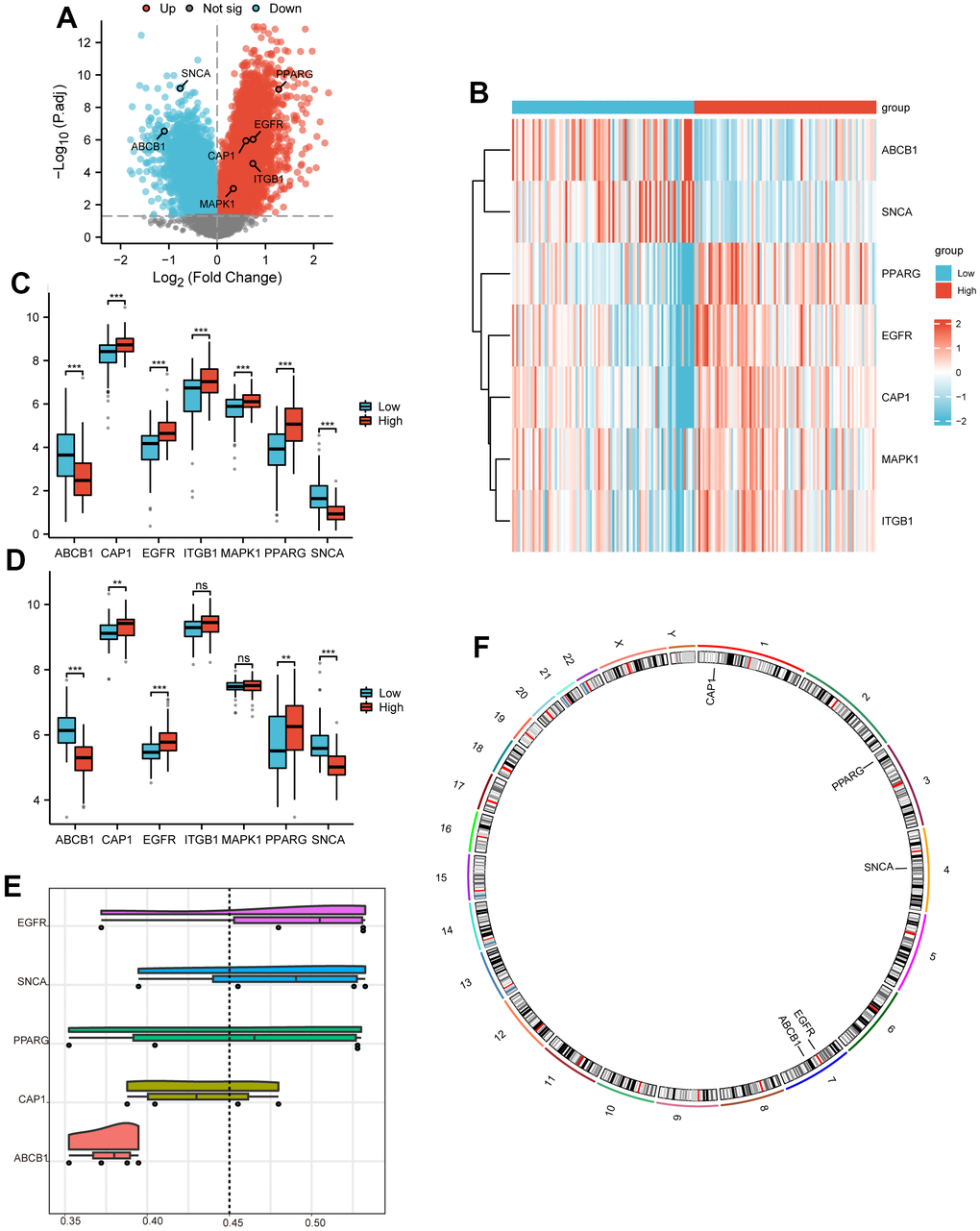 According to Figure 8D, 5 genes (ABCB1, CAP1, EGFR, PPARG, SNCA) showed statistical significance in Dataset-PAAD, selected as hub genes for subsequent analysis.