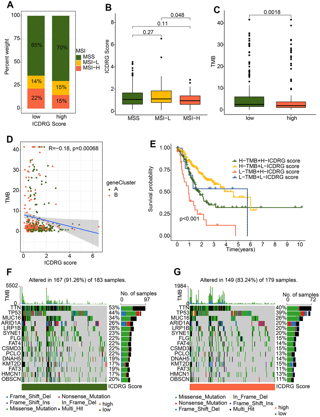 In this study, we analyze the interaction between the ICDRG score and the landscape of somatic mutations. At first, we investigated the percentage of MSI in the high and low ICDRG score subgroups, and we discovered that the high-score group had a larger percentage of MSI-L and a lower percentage of MSI-H. (Figure 10A). Importantly, GC patients with MSI-H had risk scores much lower than those with MSS and MSI-L (Figure 10B). To further investigate, we examined tumor mutation burden (TMB) values between the high and low ICDRG score subgroups and discovered that TMB was significantly lower in the ICDRG score group (Figure 10C). Subsequent correlation analysis displayed that the TMB was negatively linked with the ICDRG score (Figure 10D). Therefore, we combined TMB and ICDRG score served as a prognostic indicator, the differences in overall survival between different groups were obvious. As demonstrated by Kaplan-Meier analysis, we validated the cooperative effect of two indicators in the prognostic prediction of GC and there was no interference of the TMB status with the ICDRG scores in the prognostic predictive performance. ICDRG scores subgroups in high-score group exhibited worse prognosis in both low and high TMB status subtypes (p < 0.001) (Figure 10E). In addition, we showed comprehensive patterns of somatic variants and listed the top 15 most common mutated genes in the high- and low-risk groups. In the low-risk group, the top 5 mutated genes were TTN (53%), TP53 (44%), AUC16 (34%), ARID1A (26%), and LRP1B (28%), which exhibited high mutation frequencies than high-risk group (Figure 10F, 10G). Taken together, these results suggest that ICDRG score may act as an independent prognostic indicator and potential drug treatment target.