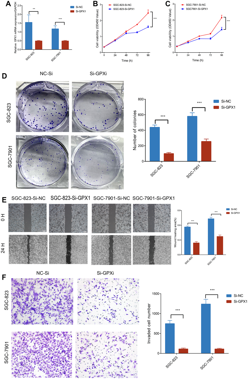 To further investigate the role of GPX1 in gastric cancer development, we transfected GPX1 siRNA into human gastric cancer cell lines SGC-823 and SGC-7901. qRT-PCR results showed that GPX1 was significantly downregulated compared to the negative control group (Figure 11A). Firstly, we detected cell proliferation activity using CCK8 at 24, 48, 72, and 96 hours, and found that the proliferation ability of SGC-823 and SGC-7901 cells was significantly lower than that of the control group at 72 and 96 hours (Figure 11B, 11C). We also observed that knocking down GPX1 significantly inhibited the colony formation ability of SGC-823 and SGC-7901 cells (Figure 11D). Next, we conducted scratch and transwell assays to evaluate the role of GPX1 in gastric cancer migration. Compared with the control group, the scratch continued to heal over time, and knocking out GPX1 inhibited the ability of cells to migrate into the scratch area (Figure 11E). Similarly, transwell analysis showed that knocking down GPX1 significantly reduced the number of SGC-823 and SGC-7901 cells that penetrated the lower chamber (Figure 11F). These results indicate that knocking down GPX1 can inhibit the proliferation, migration, and invasion ability of gastric cancer cells.