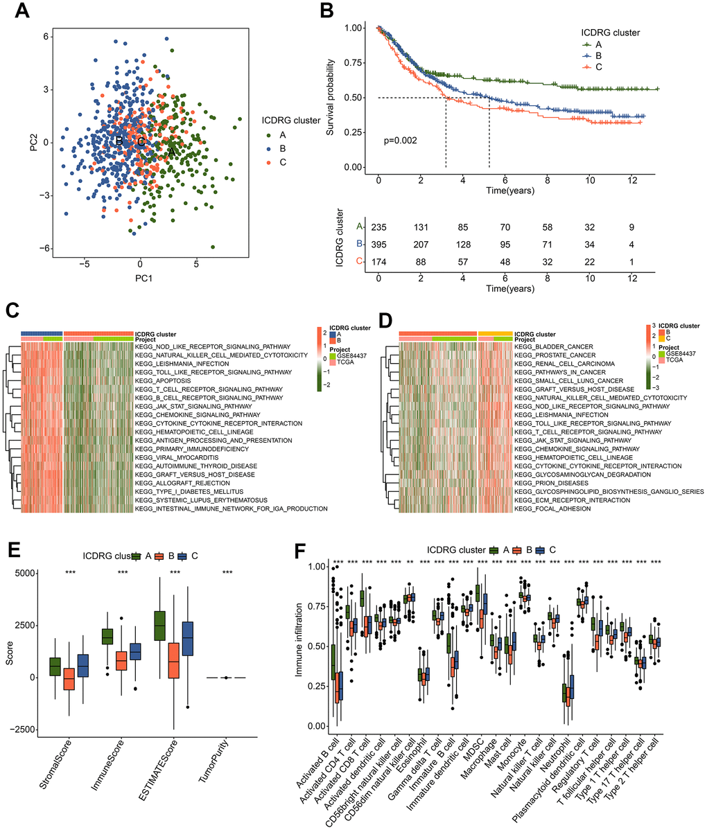 To further determine the molecular subtypes of ICDRG for GC, we enrolled 804 GC samples from the TCGA-STAD and GSE84437 to develop an unsupervised consensus clustering analysis based on the expression profile of 33 ICDRGs. As illustrated in Figure 2A, we observed that the PCA plot could clearly differentiate the ICDRG cluster A, B, and C. The prognosis analysis of GC samples in ICDRG subtypes revealed that the clinical outcome of ICDRG cluster A was better than ICDRG cluster B and C (Figure 2B). To explore the underlying regulatory mechanisms responsible for the differences in clinical outcomes between the ICDRG subtypes, the GSVA was employed to estimate the difference in KEGG signaling pathways for GC. Between ICDRG cluster A and B, immune-related regulatory pathways were clearly down-regulated in the ICFRG cluster B for GC, involving in NOD-like receptor signaling pathways, natural killer cell-mediated cytotoxicity and toll-like receptor pathway signaling (Figure 2C). Of note, we discovered that a series of tumor association function was greatly enriched in the ICDRG cluster C of the GC sample, such as bladder cancer, prostate cancer, renal cell carcinoma, and pathways in cancer (Figure 2D). Considering the GSVA results in ICDRG subtypes, the immune infiltration was assessed of GC samples in the ICDRG subgroups. The ESTIMATE analysis suggested a conspicuous difference in ESTIMATE evaluation in ICDRG cluster subgroups (Figure 2E). On the basis of the ssGSEA assessment algorithm, we detected that the fraction of most 23 immune cells was greatly higher of GC samples in ICDRG cluster A, such as activated B cell, MDSC, immature B cell, and CD8 + T cell (Figure 2F). These discoveries demonstrate that the ICDRG expression characteristic could accurately classify the GC samples into different molecular subtypes and closely related to immune infiltration.