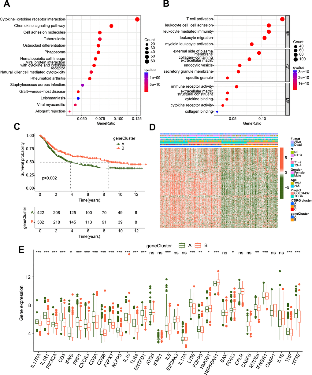 To further explore the biological mechanism of ICDRG subgroups, we explored the DEGs between ICDRG cluster A, B and C. With the criterion cutoff set as |fold change| > 1 and p < 0.05, 876 overlapping DEGs between ICDRG subgroups were obtained (Supplementary Figure 1). The KEGG analysis of DEGs implied that cytokine-cytokine receptor interaction, chemokine signaling pathway, and cell adhesion molecules were observably enriched (Figure 3A). GO bubble diagram illustrated that T cell activation, leukocyte cell–cell adhesion, immune receptor activity, and external side of plasma membrane were enriched with DEGs (Figure 3B). Those enrichment results suggested that immune-associated function may participate in the role of ICDRG subgroup-based DEGs in the progression of GC. Thereafter, those DEGs were enrolled to explore the prognosis implications for GC samples via univariate Cox analysis, and 244 prognostic variates were collected in total. On the basis of 244 prognostic variates, an unsupervised consensus clustering analysis was carried out to classify the GC samples into 2 gene-cluster subgroups, with 422 samples in gene-cluster A and 382 samples in gene-cluster B. The analysis of clinical outcome revealed that the survival rate of GC samples in gene-cluster A was worse than in gene-cluster B (p = 0.002, Figure 3C). The heatmap plot implied the relationship between 244 prognostic variates expression profile and clinical features, and the result showed the expression level of 244 prognostic variates was greatly lower in gene-cluster B for GC (Figure 3D). The expression of ICDRGs suggested that most of ICDRGs were upregulated of GC samples which with poor prognosis, such as IL17RA, IL1R1, PIK3CA, and CD4 (Figure 3E).