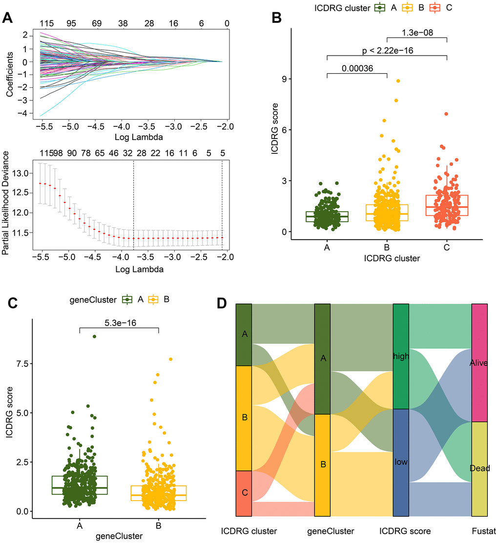 The ICDRG score was evaluated based on the ICDRG subtypes-based DEGs to divide the GC into different risk subgroups. The LASSO analysis selected 31 feature variables from the ICDRG subtypes-based prognostic DEGs for the subsequent analysis (Figure 4A). Multivariate Cox analysis identified 17 momentous variables to establish the ICDRG score model. In the ICDRG cluster subgroup, a noteworthy difference was observed between the ICDRG cluster subgroups, which the ICDRG score of GC samples in ICDRG cluster C was conspicuously higher than other ICDRG subgroups (Figure 4B). In the gene-cluster subgroups, we also found that the GC samples with poor clinical prognosis in the gene-cluster A had higher ICDRG score than gene-cluster B (Figure 4C). As displayed in Figure 4D, The Sankey plot revealed the relationship between ICDRG score, clinical status, ICDRG cluster subgroup, and gene-cluster subgroup. In summary, those discoveries demonstrate that the ICDRG score developed of cluster-related DEGs is closely associated with the prognosis for GC and could distinguish the GC samples into different risk subgroups in ICDRG molecular subtypes and gene-cluster subtypes.