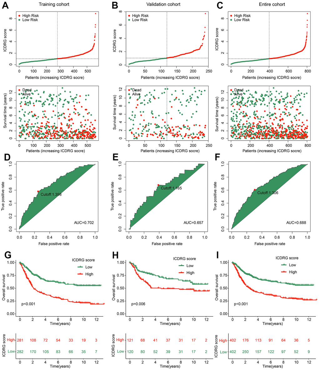 We developed a risk model to predict the clinical prognosis for each GC sample based on the ICDRG score. Under the division cutoff of 7:3, the GC samples were assigned into training and test cohorts, respectively. According to the median ICDRG score, the GC samples in the training, test, and entire cohorts were classified into low- and high ICDRG score subtypes (Figure 5A–5C). The results implied that the GC samples with high ICDRG scores observably tend to lower survival times. ROC analysis of ICDRG score in the training, test and entire cohorts was 0.702, 0.657, and 0.688, respectively (Figure 5D–5F). Clinical prognosis curve analysis implied that the clinical outcome of GC samples with high ICDRG scores was observably lower than those with low ICDRG scores in the training, test, and entire cohorts (Figure 5G–5I). We thus speculate that ICDRG scores could accurately distinguish the GC samples into two risk subtypes, and the high ICDRG score is associated with poor prognosis in GC.