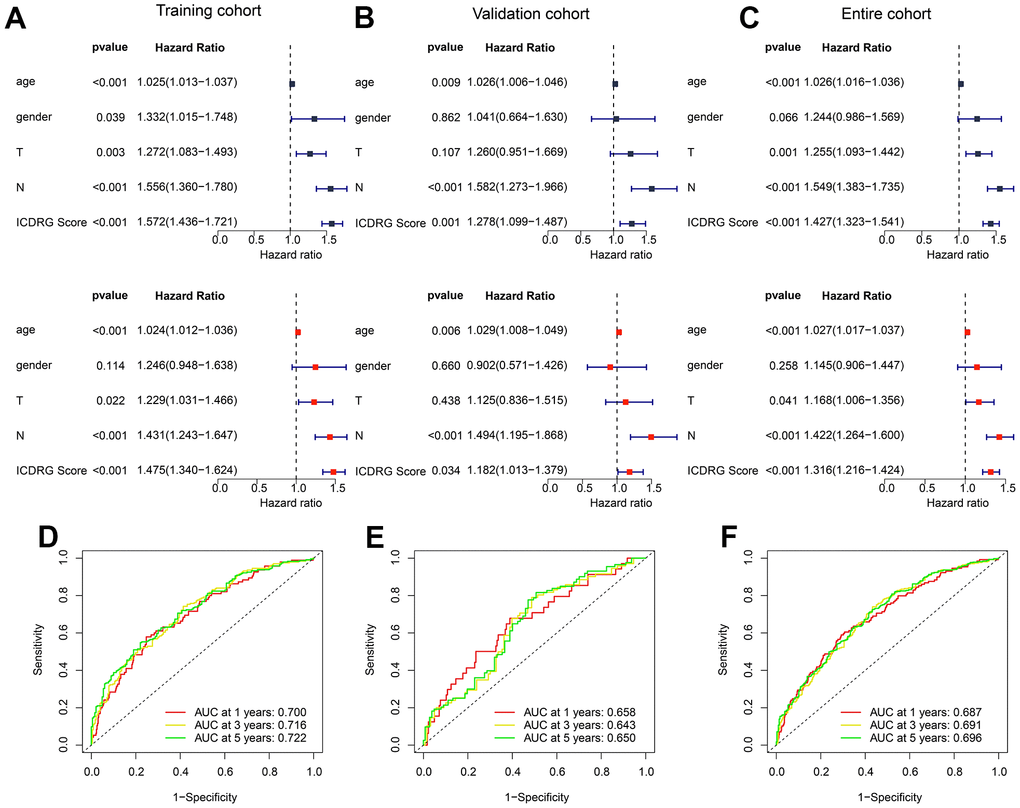 In the view of ICDRG in predicting clinical prognosis for GC, we comprehensively analyzed the independence of ICDRG and different clinicopathological features in GC. In the training cohort, the results of univariate Cox analysis (p < 0.001, HR = 1.572(1.438-1.721)) and multivariate Cox analysis (p < 0.001, HR = 1.475(1.340-1.624)) displayed that the ICDRG score was explored as a risk factor with poor clinical prognosis (Figure 6A). In the test cohort, we observed that the ICDRG score was considered a poor prognosis factor via the univariate Cox analysis (p = 0.001, HR = 1.278(1.099-1.487)) and multivariate Cox analysis (p = 0.034, HR = 1.182(1.013-1.379)) (Figure 6B). In the entire cohort, the results of univariate Cox analysis (p < 0.001, HR = 1.427(1.323-1.541)) and multivariate Cox analysis (p < 0.001, HR = 1.316(1.218-1.424)) also demonstrated that the ICDRG score was an independent prognosis predictor which related to the poor clinical outcome for GC (Figure 6C). ROC curve analysis revealed that the AUC of 1-, 3-, and 5 years was 0.700, 0.716, and 0.722 in the training cohort, 0.658, 0.643 and 0.650 in the test cohort, 0.687, 0.691 and 0.696 in the entire cohorts, respectively (Figure 6D–6F).