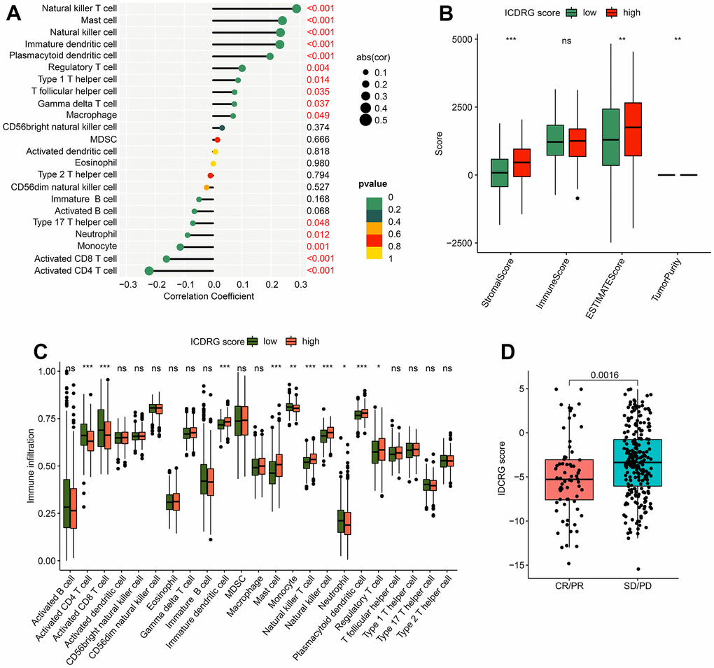 The potential relationship of ICDRG score and immune infiltration was further explored and the result implied that the ICDRG score was positively correlated with macrophage, gamma delta T cell, T follicular helper cell, type 1 T helper cell, regulatory T cell, plasmacytoid dendritic cell, immature dendritic cell, natural killer cell, mast cell, and natural killer T cell. However, a noteworthy negative correlation was observed between ICDRG score and CD4+ T cell, CD8+ T cell, monocyte, neutrophil, and type 17 T helper cell (Figure 8A). According to the ESTIMATE assessment algorithm, the stromal and ESTIMATE score were higher in the high ICDRG score group, but the tumor purity was lower in the high ICDRG score group (Figure 8B). Using ssGSEA, we investigate the different distribution of 23 immune cells in the high- and low-risk groups. The results revealed that the high-risk group had higher proportions of macrophages, natural killer cells, and plasmacytoid dendritic cells while having lower proportions of activated CD4 T cells, activated CD8 T cells, and neutrophils. (Figure 8C). In addition, we found that the ICDRG score had significantly higher stable/progressive disease (SD/PD) compared to responders (CR/PR) (Figure 8D).