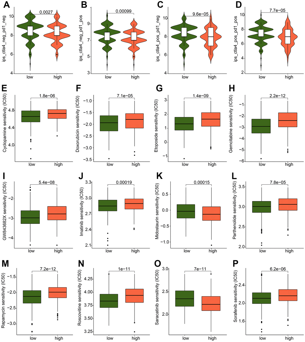 The IPS results revealed that the GC patients in the low-risk group were more sensitive to the PD-1, CTLA-4, and PD 1/CTLA-4 treatment (Figure 9A–9D). Moreover, we discovered that the ICDRG score subgroups respond differently to chemotherapeutic medicines based on the IC50 calculation. In detail, the high-risk score had lower IC50 levels for midostaurin and saracatinib, indicating that chemotherapy may have a greater impact on high-risk patients. While, the GC patients with low-risk score were more sensitive to cyclopamine, doxorubicin, etoposide, gemcitabine, GW843682X, imatinib, parthenolide, rapamycin, roscovitine and sorafenib (Figure 9E–9P). These findings suggest that the ICDRG score might be immune-related and might be able to predict the GC chemotherapy therapy.