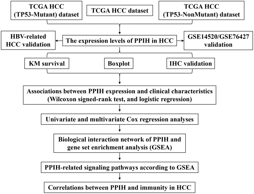 Several informatics technologies were utilized in the current research to inspect Ppih expression as well as its predictive value in HCC. Additionally, data from 158 HCC patients with HBV-related disease demonstrated that Ppih’s mRNA expression was markedly upregulated. In addition, we utilized immunohistochemistry (IHC) to validate the expression of Ppih in HCC tissues. We utilized TCGA, GeneMANIA, and STRING data sources to conduct GSEA and PPI systems to further examine the roles of Ppih in HCC. Interestingly, we explored the interaction between Ppih and TP53 in relation to HCC. The design and methodology of our study can be seen in the flowchart depicted in Figure 1.