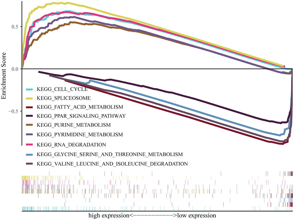 To conduct research on the role of Ppih and associated signaling pathways in HCC, we performed GSEA on the high and low Ppih expression datasets. The differentially expressed genes between high and low Ppih expression datasets that was used as input for GSEA in Supplementary Table 2 (logFCfilter = 1). The MSigDB collection was utilized for GSEA (c5.all.v7.5.1.symbols.gmt). With FDR and NOM score ps below 0.05 as cutoffs, we examined differentially enriched GO and KEGG pathways connected to the Ppih high expression phenotype (Table 5). The Ppih high expression phenotype was differentially enriched for pathways involved in the spliceosome, pyrimidine, purine, cell cycle, and degradation of RNA (Table 5, Figure 10). Gene sets involved in the degradation of valine, leucine, and isoleucine as well as the metabolism of fatty acids, glycine, serine, and threonine as well as the PPAR signaling pathway also showed differential enrichment in the low Ppih gene expression phenotype (Figure 10).