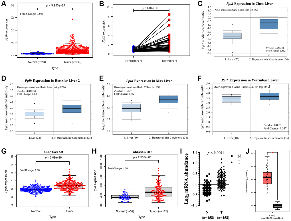 The mRNA levels of Ppih in cancer and matched specimens in the normal state or neighboring specimens in the normal state were evaluated via various different online data sources to determine the differences in the expression of Ppih within HCC and normalized controls. According to boxplots and the paired differential plot (Figure 2A, 2B), HCC specimens had substantially higher mRNA expression for Ppih than normal liver tissues (p < 0.001). According to the information in the Oncomine 4.5 data sources, HCC was also substantially increased in many datasets for Ppih’s transcriptional expression. Ppih showed a 3.362-fold increase in HCC in the Chen liver dataset (Figure 2C). Additionally, Roessler, Mas, and Wurmbach discovered that mRNA expression for Ppih increased in HCC samples by 1.406-fold, 1.352-fold, and 1.317-fold, respectively (Figure 2D–2F). Consistent with the results in the TCGA set, the boxplots of the two validation sets (GSE14520 and GSE76427) also showed that Ppih expression was significantly higher in HCC tissues than in normal tissues (Figure 2G, 2H). The main contributing factor to HCC is chronic hepatitis B and C virus infection [21]. Accordingly, via the RNA sequencing expression data from the research of Gao et al. [21], we examined the expression of Ppih in HCC associated with the HBV. According to Figure 2I, HBV-related HCC had substantially higher Ppih mRNA levels than matched noncancer liver tissues (n = 158) (p < 0.0001). Moreover, a multivariate analysis of HCC patients with HBV-related HCC revealed that mRNA expression for Ppih was associated with a history of liver cirrhosis (p < 0.05) (Supplementary Table 1). Additionally, in the GEPIA2 data sources, customers with cholangiocarcinoma (CHOL) also had enriched Ppih mRNA levels (p < 0.05). (Figure 2J).