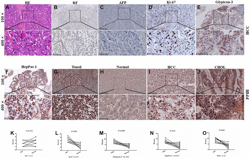 To fully establish whether the obtained tissues were HCC, as depicted in Figure 3A–3F, we first combined conventional H&E staining with reticular fiber staining and IHC markers (AFP, Ki-67, Glypican3, and HepPar-1). Then, IHC staining was performed on HCC tissues that had been embedded in paraffin. On paraffin-embedded slides, protein analysis consistently showed that PPIH, Ki-67, Glypican3, and HepPar-1 were significantly overexpressed in HCC tissues compared to nearby specimens under typical conditions (Figure 3G–3I and 3K–3O). Interestingly, CHOL tissues also showed substantially overexpression of PPIH (Figure 3J).