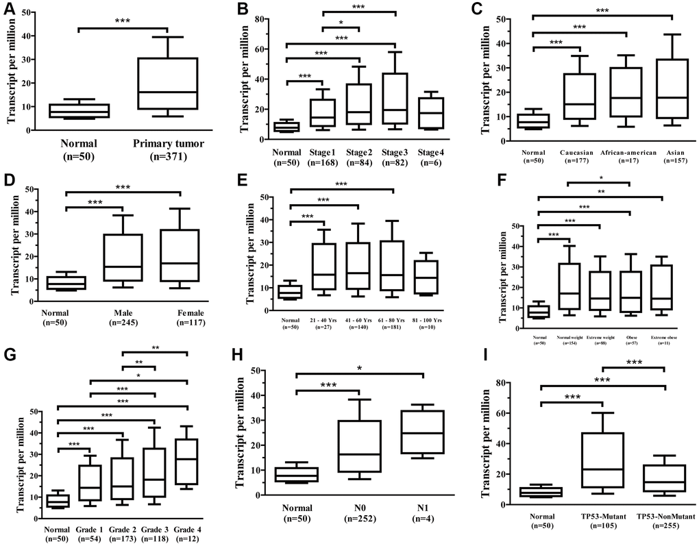 The UALCAN data sources were utilized to further subgroup evaluate the association between mRNA expression for Ppih and clinicopathological characteristics of HCC patients. The findings demonstrated a strong correlation between the Ppih mRNA expression as well as every client’s specific cancer phase, race, sex, age, weight, cancer grade, nodal metastatic status, and TP53 mutation status (Figure 4A–4I). In instance, mRNA expression for Ppih among patients with HCC was substantially related to more advanced (Figure 4B) and less-differentiated tumors (Figure 4G), with greater mRNA expression for Ppih levels. Additionally, the greatest mRNA expression levels were observed in stage 3 and/or grade 4 individuals. Stage 4’s limited sample size may be the cause of stage 3’s increased mRNA expression for Ppih when compared to stage 4. (Figure 4B). Additionally, mRNA expression for Ppih was substantially increased among patients with HCC with TP53 mutations and was favorably correlated with TP53 mutant status (Figure 4I). Additionally, groups identified by the cancer pathological stage (p < 0.001, Figure 5A), tumor differentiation (Grade) (p < 0.001, Figure 5B), and T stage (p < 0.001, Figure 5C) differed in the amount of Ppih expression. The correlations between Ppih expression and seven clinical parameters (age, sex, grade, stage, T stage, M stage, and N stage) among patients with HCC from the TCGA dataset were further evaluated via logistic regression analysis. The expression level of Ppih in HCC steadily rose as the clinical stage, grade, and T stage advanced, as seen in Table 1.