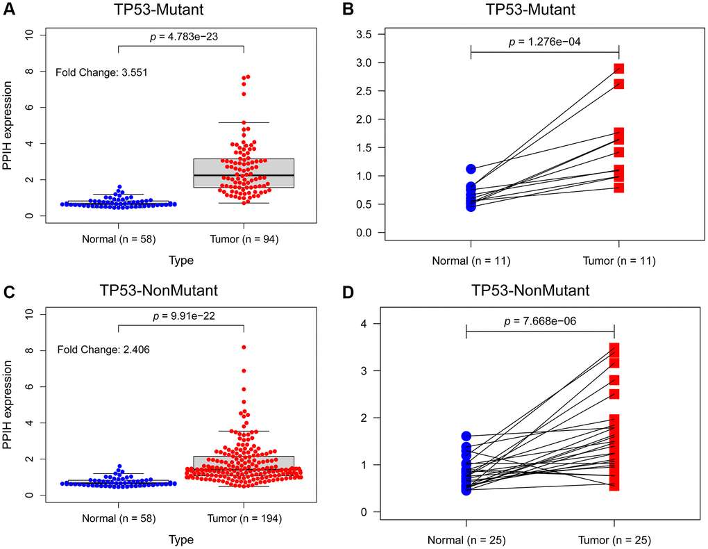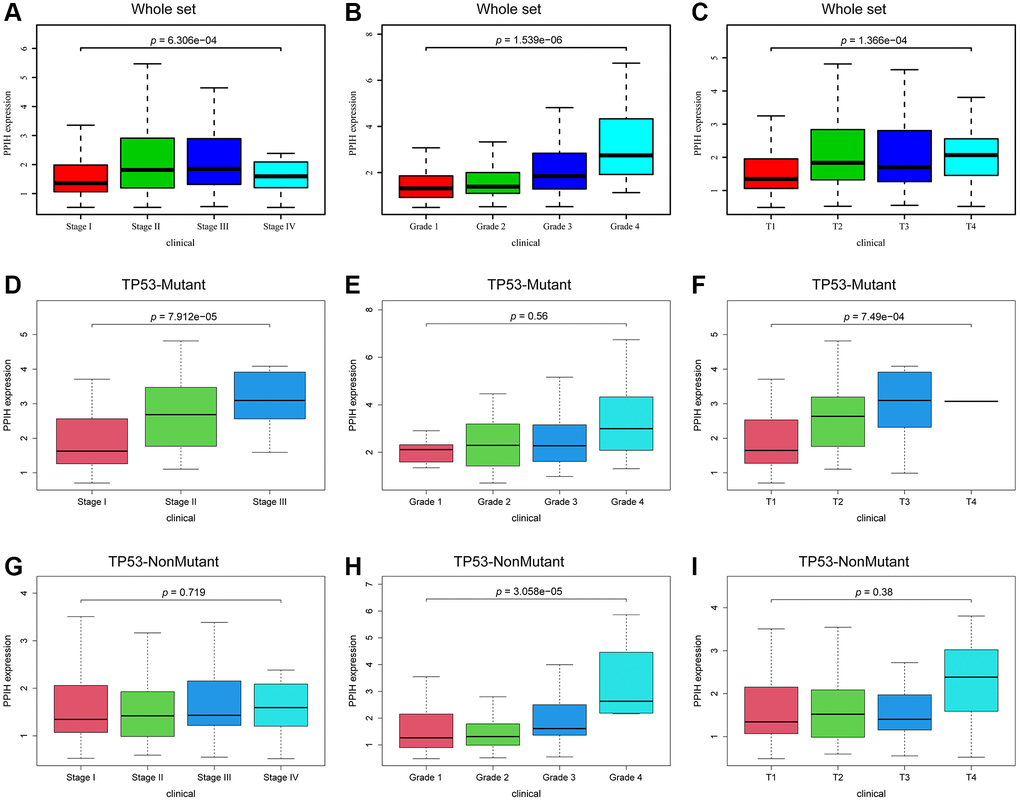 To further determine if elevated expression of PPIH mRNA correlates with TP53 mutation status, we sourced somatic gene mutations for American HCC samples (n = 374) from the TCGA portal (https://portal.gdc.cancer.gov/). Of these, 91 HCC samples exhibited TP53 mutations, 189 samples did not present any TP53 mutations, and all these samples were accompanied by comprehensive clinical data. Figure 6A–6I illustrates that, in comparison to normal liver tissues, PPIH mRNA was markedly overexpressed in both TP53 mutated (Fold change: 3.551, p < 0.001) and non-mutated (Fold change: 2.406, p < 0.001) HCC cases. Notably, the heightened expression of PPIH mRNA was more pronounced in TP53 mutated HCC (See Figure 6A, 6C). Furthermore, the expression level of PPIH mRNA demonstrated a positive correlation with the cancer pathological stage (p < 0.001, Figure 5D), tumor differentiation grade (Figure 5E), and T stage (p < 0.001, Figure 5F) among HCC patients carrying TP53 mutations. However, no significant relationship was discerned between PPIH mRNA expression and these clinical characteristics for HCC patients without TP53 mutations (See Figure 5G–5I). Using logistic regression to delve deeper into the relationship between PPIH mRNA and clinical attributes of HCC patients (both with and without TP53 mutations), we arrived at consistent findings. As the cancer pathological stage and T stage advanced, there was a progressive increase in the expression level of PPIH mRNA in HCC, as delineated in Tables 2 and 3.
