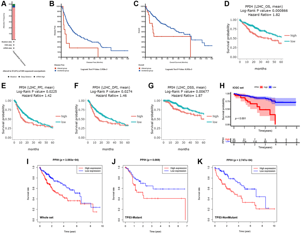 We assessed the predictive efficacy of mRNA expression for Ppih in patients with HCC via the DriverDBV3 data sources to determine whether high Ppih expression may serve as a prognostic signature of HCC patients. High Ppih expression was associated with poor OS, progression-free interval (PFI), disease-free interval, and disease-specific survival among patients with HCC, as depicted in Figure 7D–7G (HR = 1.82, log-ranking p = 0.0009, PFI, HR = 1.42, log-ranking p = 0.0225, DFI, HR = 1.46, log-ranking p = 0.0274, DSS, HR = 1.87, log-ranking p = 0.0068). To validate the predictive value of the Ppih, we plotted the Kaplan-Meier curve with the optimal cutoff score (cutpoint = 22.89) for patients in ICGC set. Consistent with the results in the TCGA cohort, patients in the high-expression group have shown significantly poorer OS than patients in the low-expression group (p < 0.001) (Figure 7H). We further investigated the impact of TP53 mutation status on the relationship between Ppih expression and overall survival (OS) in HCC patients. As depicted in Figure 7, regardless of the TP53 mutation status, HCC patients with elevated Ppih expression exhibited a reduced survival rate. However, due to the limited sample size, the Kaplan-Meier survival analysis indicated that high Ppih expression did not significantly correlate with a worse prognosis in HCC patients with TP53 mutations (Figure 7J). Yet, it’s noteworthy that among the HCC patients with TP53 mutations, only 5.49% (5 out of 91) of those in the high Ppih expression bracket survived beyond 5 years. In contrast, in HCC patients lacking TP53 mutations, 14.29% (27 out of 189) from the high Ppih expression group survived past the 5-year mark.