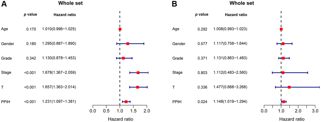 Additionally, via data from the Kaplan-Meier plotter, we performed univariate and multivariate analyses on the clinical outcomes related to the expression of Ppih within different clinicopathological factors. Among patients with HCC with diverse clinicopathological factors, such as gender, race, sorafenib treatment, phase, grade, AJCC_T, alcohol intake, and hepatitis virus+/−, a univariate analysis found a significant correlation between mRNA expression for Ppih and OS (Table 4). mRNA expression for Ppih and OS among patients with HCC were proven to be substantially correlated in the multivariate analysis (Table 4). To analyze the effect of Ppih expression as well as other clinicopathological variables on survival, univariate and multivariate analyses via the Cox proportional hazard regression model were also performed on 349 HCC patients. According to Figure 8A, 8B, clinical stage (HR = 1.678; 95% CI, 1.367–2.059; p < 0.001), T stage (HR = 1.657; 95% CI, 1.363–2.014; p < 0.001) and Ppih expression levels were all substantially linked with poorer OS. In the multivariate analysis, high Ppih expression in particular was the only independent prognostic factor to be positively correlated with OS (HR = 1.148; 95% CI, 1.019–1.294; p = 0.024).