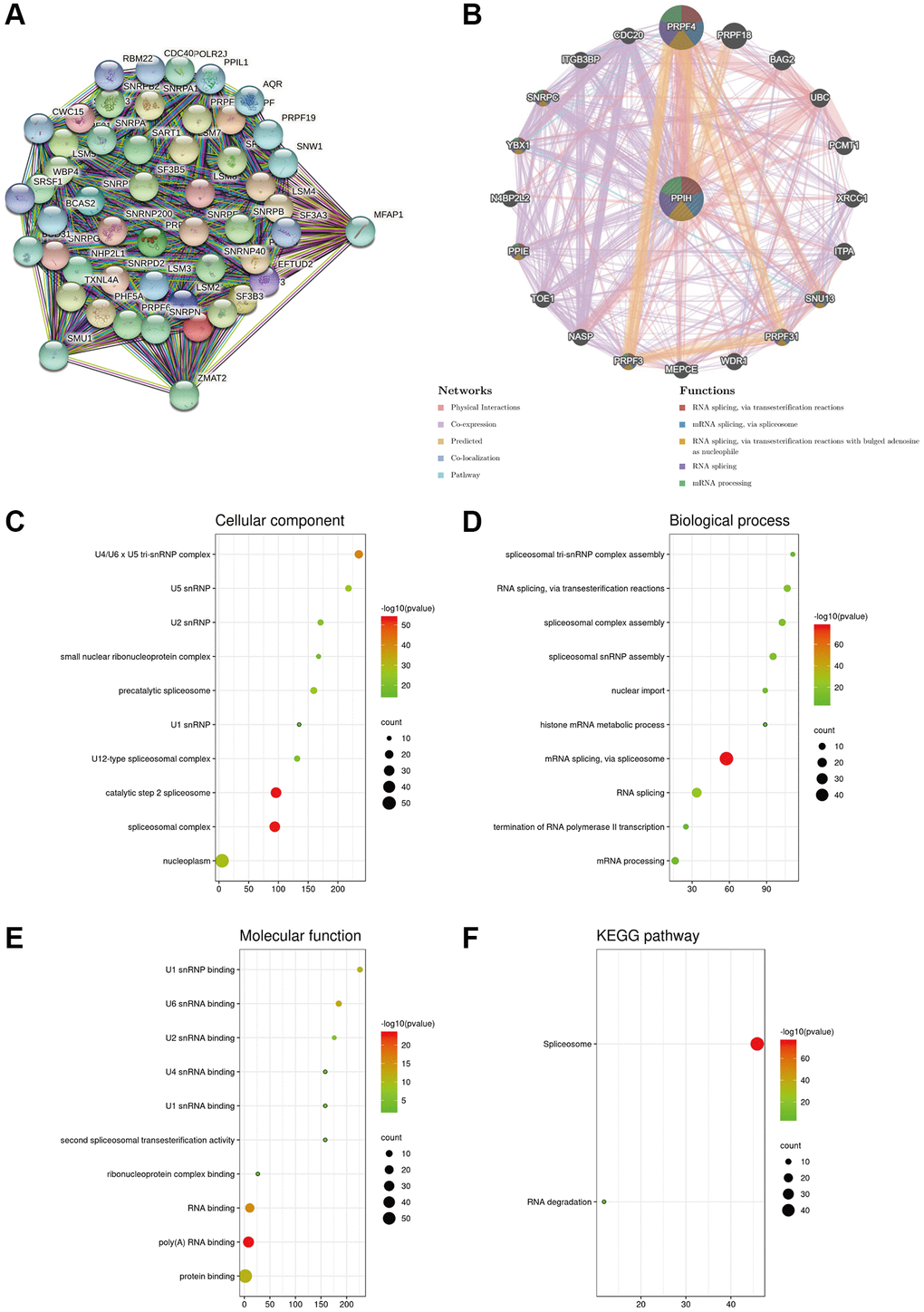 A PPI system of Ppih (top 50) was created via the STRING data sources to better understand the molecular function of Ppih and the signaling pathways in which Ppih is engaged (Figure 9A). Twenty genes were also proven to be enriched in the Ppih system, according to the GeneMANIA assessment of the PPI system. RNA is spliced by transesterification reactions, mRNA is spliced by the spliceosome, and RNA is spliced by transesterification reactions with bulged adenosine as a nucleophile (Figure 9B). To determine the functional enrichment of these 65 interactors according to the STRING and GeneMANIA data sources, gene ontology (GO) and Kyoto Encyclopedia of Genes and Genomes (KEGG) studies were carried out via bioinformatics data sources (http://www.bioinformatics.com.cn/). The cellular component analysis revealed that these proteins were mostly found in the U4/U6 U5 tri-snRNP complex, in U5 snRNP, and in U2 snRNP, as depicted in Figure 9C–9E. The most prevalent biological processes were the construction of the spliceosomal tri-snRNP complex and RNA splicing via transesterification events. These proteins were primarily involved in the binding of the U1 snRNP and the U6 snRNA, according to an analysis of their molecular functions. The co-expressed genes were mostly engaged in the spliceosome and degradation of RNA, according to the KEGG pathway outcomes (Figure 9F).