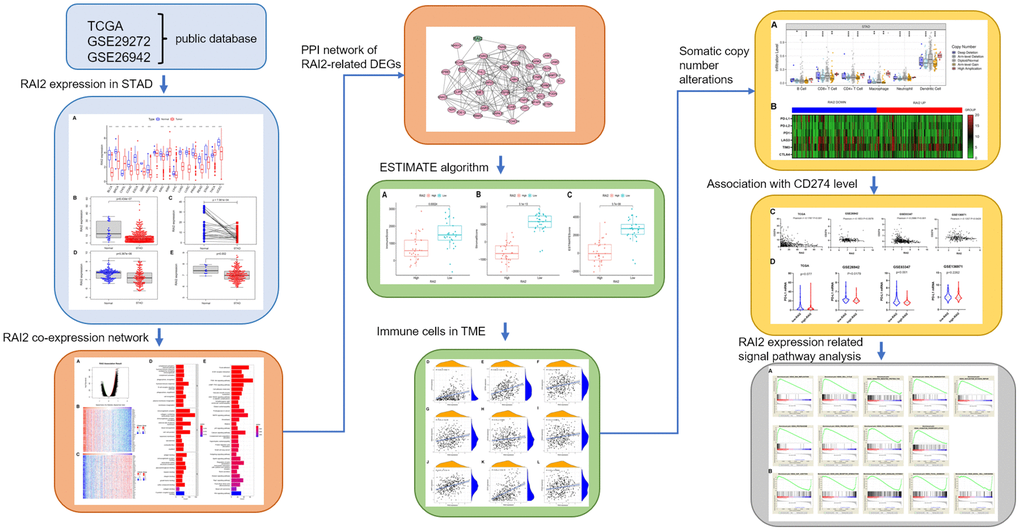 Retinoic acid-induced 2 (RAI2) is an innovative tumor suppressor [7, 8] and as a newly discovered gene, little has been discovered regarding the way it works biologically. RAI2, located in the Xp22 region of the chromosome, expresses a 2.5 kb transcript and plays a pivotal role in the regulations controlling embryonic tissue development and cell growth [9]. However, there have been a few studies conducted on RAI2 in malignant tumorigenesis, progression, and metastasis. In 2015, Werner et al. [8] revealed for the first time that lower expression of RAI2 was an independent prognostic factor for breast cancer patients. Further investigations pointed out that RAI2 promoted the expression of various cellular differentiation genes by interacting with the transcription factor carboxyl-terminal binding protein 2 (CtBP2), which ultimately inhibited the early hematogenous metastasis of human breast cancer cells to bone marrow. Yan et al. [7] found that RAI2 inhibited the proliferation of colorectal cancer cells via blocking the AKT signalling pathway. The expression of RAI2 in human colorectal cancer is regulated by methylation in its promoter region, and RAI2 methylation is an indicator of poor prognosis for patients with colorectal cancer. More recently, Yang et al. [10] investigated the mechanisms of RAI2 expression and found that in bladder cancer the circRNA RBPMS-miR-330-3p signaling axis could regulate the expression of RAI2. Nonetheless, the activities of RAI2 in GC progression is mainly unknown. In the current study, the effect of RAI2 on GC growth and invasion was discovered and its potential mechanisms identified using various public databases analysis (Figure 1) and a sequence of in vitro experiments. We found that RAI2 could decrease the proliferation and invasion in GC cells through reducing PD-L1 expression and related to tumor-infiltrating lymphocytes (TILs), suggesting that it may be an innovative treatment option for GC patients.