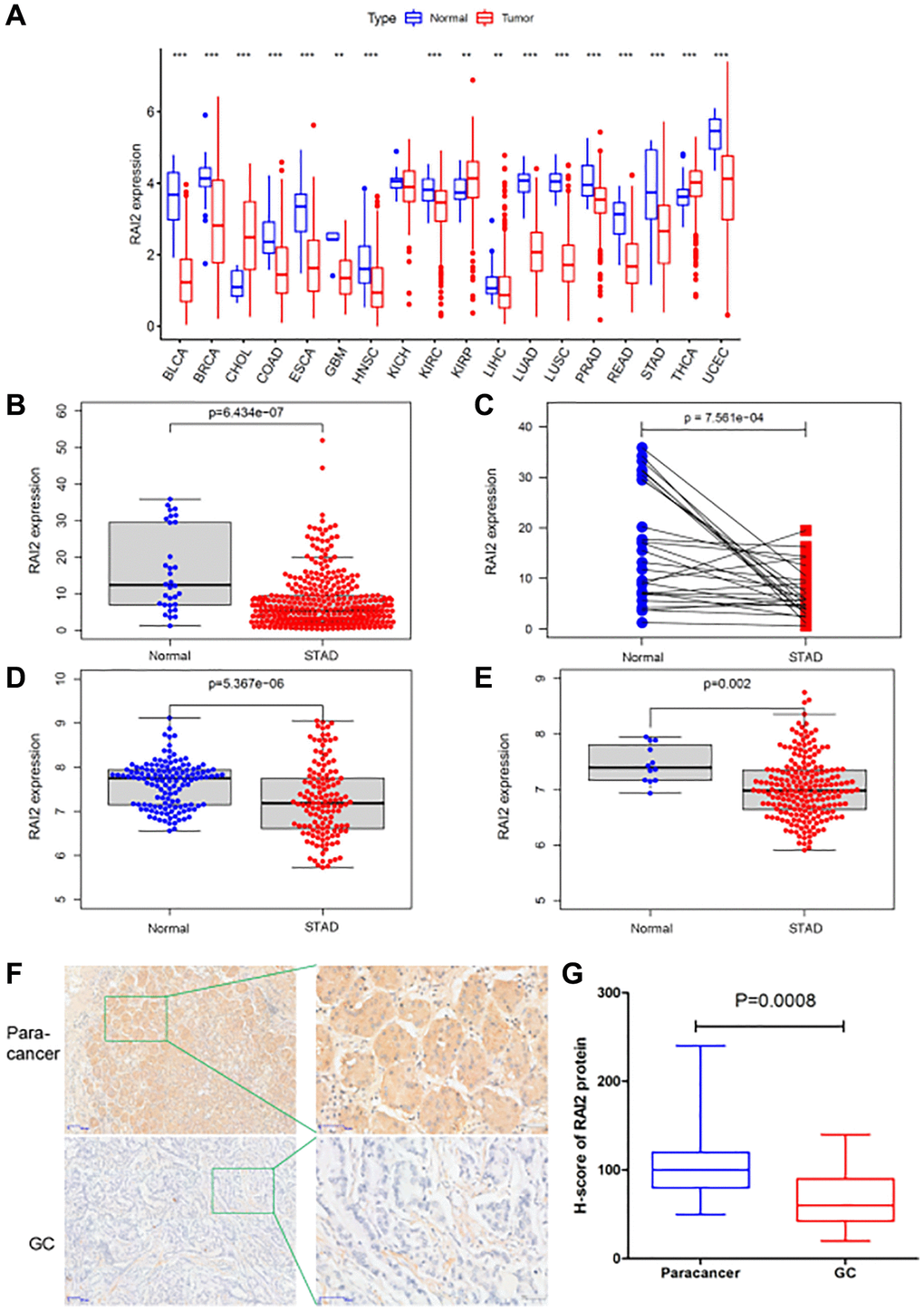 In the current research, we relied on bio-informatics to examine the expression of RAI2 in pan-cancer and discovered that RAI2 was abnormally expressed in the majority of malignancies, including GC. To further establish the relationship between RAI2 and GC, RNA-seq data in TCGA and GEO were analyzed, respectively. We established that the RAI2 levels were significantly decreased in GC, and this was further confirmed by means of an IHC staining assay on 20 pairs of GC and paracancer tissue samples.