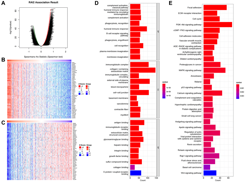 To find out the biological functions of RAI2 in GC, we analyzed the RAI2 co-expression network in the STAD cohort applying LinkedOmics. The analysis showed that 636 genes (dark red dots) correlated greatly with RAI2, while 468 genes (dark green dots) exhibited a significant negative correlation with RAI2 (false discovery rate, FDR < 0.01) (Figure 3A). The heat map displays the top 50 genes closely associated with RAI2 expression and the top 50 genes not associated with RAI2 expression (Figure 3B, 3C). RAI2 expression was significantly in association with SET binding protein 1 (SETBP1, positive rank #1), which was involved in DNA replication. On the other hand, ribonucleotide reductase regulatory subunit M2 (RRM2), which catalyzes the formation of deoxyribonucleotides, was shown to be the most negatively correlated gene to RAI2. RRM2 was synthesized in a cell-cycle-dependent manner. GO term annotation analysis confirmed that RAI2-related genes primarily engaged in humoral immune response, collagen-containing extracellular matrix, and antigen-binding (Figure 3D). Also, KEGG pathway analysis implied that the RAI2 co-expressed genes were clustered in pathways such as focal adhesion, ECM-receptor interaction, PI3K-Akt signaling pathway, MAPK signaling pathway, cell cycle pathway and among others (Figure 3E). Furthermore, the PPI network of the significant RAI2-related genes was constructed using the STRING database. The resulting network of RAI2-related genes was built and visualized using Cytoscape software, and it contained 40 nodes in the mRNA network which formed 161 connections (Supplementary Figure 1). This data proved that RAI2 played a key part in cell adhesion/invasion, immune regulation, DNA replication, and cell cycle in GC.