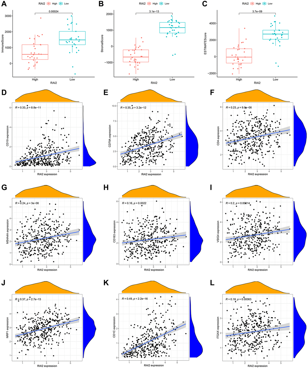 To explore the penetration of immune cells and stromal cells within tumour sites, we computed the immune score and stromal score of gastric samples in the TCGA STAD dataset by way of the ESTIMATE algorithm (Figures 4A, 4B). Moreover, the ESTIMATE score, which represents tumor purity, was obtained by adding the immune and stromal scores (Figure 4C). These results indicated that samples with lower RAI2 expression contained more immune and stroma cells (Figure 4A–4C). Subsequently, we inquired into the specific types of immune cells in the tumor microenvironment based on the cell markers. The expression of B cells, CD4+ T cells, M2 macrophages, and dendritic cells were correlated significantly with RAI2 expression level (Figure 4D–4L).