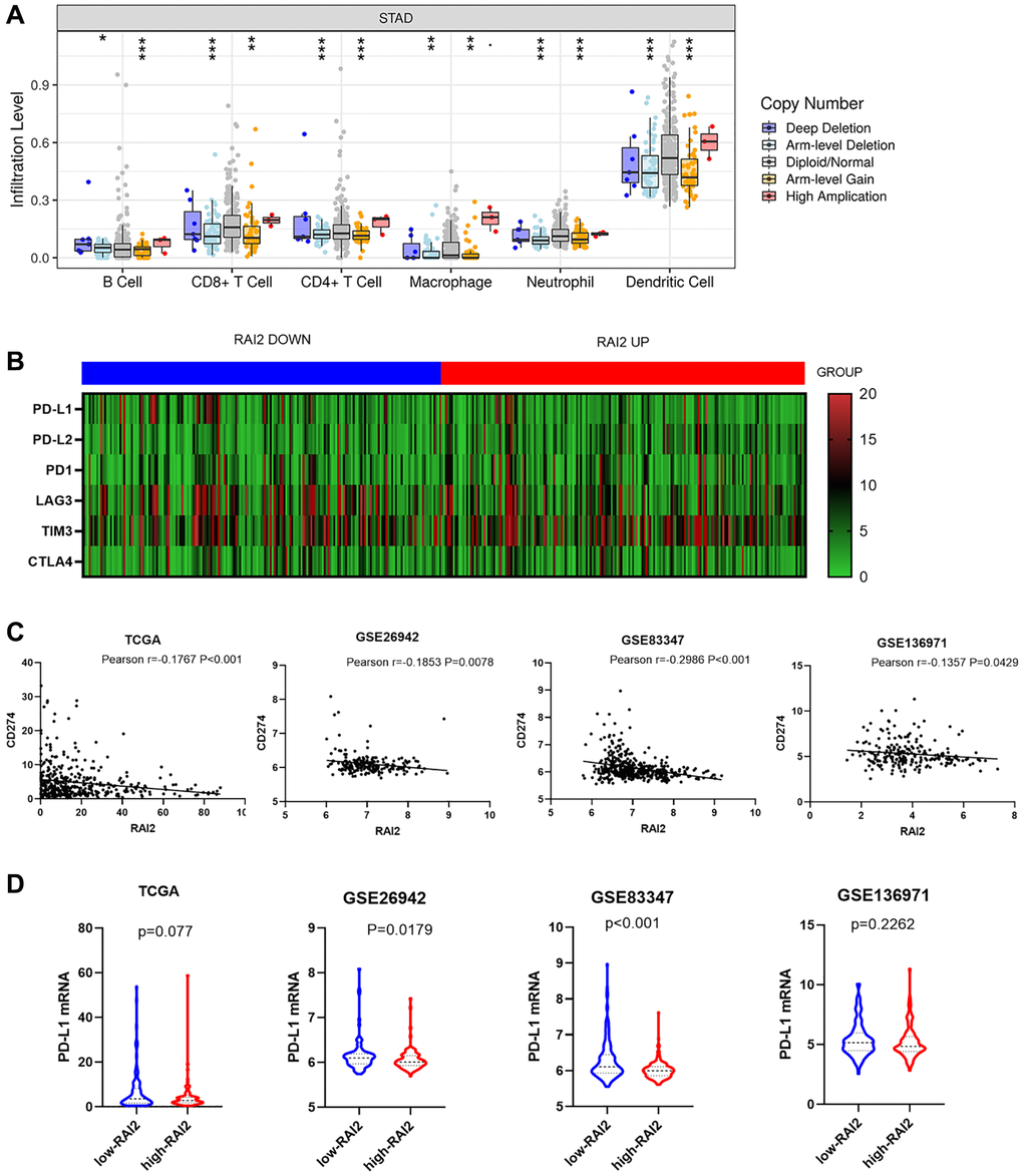 In this research, the TIMER website was used to examine the causal connection between tumour infiltration levels and specific somatic copy number alterations for RAI2. The results revealed the RAI2 copy number variation (CNV) was highly associated with B cells, CD4+ T cells, CD8+ T cells, neutrophils, macrophages, and dendritic cells (Figure 5A). With the recent interest in immune-checkpoint inhibitor therapy research, we wanted to investigate the relationship between RAI2 and immune checkpoint in STAD. Through the TIMER website, a negative correlation was found between CD274 and RAI2, however, there was no statistical significance found among PD-L2, PD1, LAG3, TIM3, and CTLA4 (Figure 5B). Furthermore, the association between the up-regulation of RAI2 expression level and decreased CD274 level was observed by analyzing GC samples from the TCGA, GSE26942, GSE83347, and GSE136971 datasets (Figure 5C). Additionally, up-regulation of RAI2 mRNA level also associated with decreased CD274 mRNA level throughout the four databases (Figure 5D). These findings provided preliminary evidence that RAI2 may be a novel predictor in immunotherapy in GC.