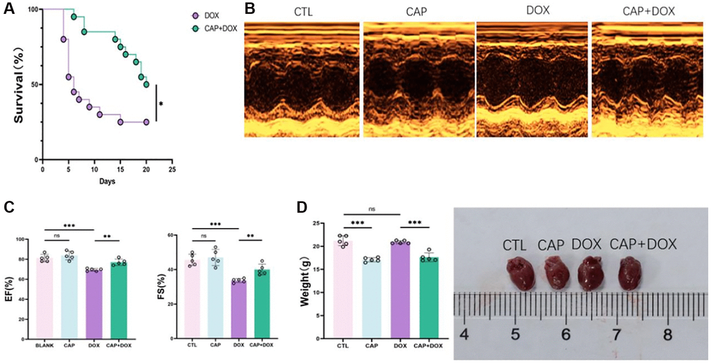 When comparing the CAP and CAP+DOX groups of mice individually, we found that CAP had a protective effect on the myocardium, as indicated by improved levels of BNP and MYH7 in the CAP group compared to the CTL group.