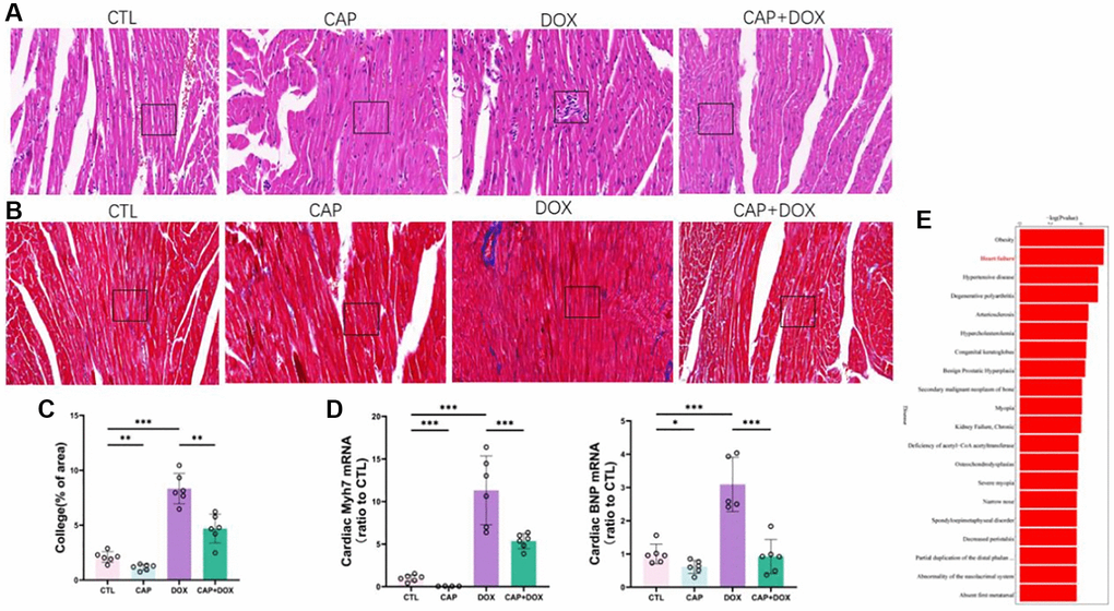 The survival rate of mice pretreated with CAP (Figure 1A) was higher than that of the DOX group during the observed 20 days. To investigate the gross changes in the mouse heart, we performed echocardiography on four groups of mice (Figure 1B) and found that DOX worsened HR FS EF in mice, but CAP prevented the deterioration of the hearts of mice in the DOX group, resulting in a corresponding improvement in the short-axis shortening ratio of the left ventricular (LV) (Figure 1C left) and the Ejection Fraction (EF) (Figure 1C right). Upon dissecting the mouse hearts, we found that the hearts of mice in the DOX group were larger than those in the control(CTL) group, while the hearts of mice in the CAP+DOX group were smaller than those in the DOX group (Figure 1D left), and when considering the mice’s weight (Figure 1D right), the compensatory increase in heart volume caused by the CAP+DOX group was reduced, thereby reducing the compensation of the heart due to the decreased blood supply caused by DOX, which was sufficient to support the weight of the mice. Tissue analysis of the mouse hearts using HE staining showed that the arrangement of myocardial cells in the DOX group was more disorderly than that in the other three groups, and mice in the CAP+DOX group was apparently better than those in the DOX group (Figure 2A). Using Masson staining to observe the content of collagen fibers (Figure 2B), the hearts of mice in the CAP+DOX group contained significantly less collagen fibers than those in the DOX group (Figure 2C). Measurement of heart failure indicators showed that BNP and MYH7 in the heart muscle of mice in the CAP+DOX group were notably lower than those in the DOX group (Figure 2D). The decrease in these two genes, which serve as indicators of heart failure, suggests that CAP is effective in reducing DOX-induced heart failure [25, 26]. Additionally, we found that the group treated with CAP alone also demonstrated better performance than the CTL group, and we believe that CAP did play a key role in protecting cardiovascular function, as previously reported in the literature. KEGG disease enrichment was used to analyze the CAP+DOX group and DOX group using RNA-seq methodology, revealing differences in disease between the CAP+DOX and DOX groups, with heart failure ranking second (Figure 2E). In conclusion, CAP not only protected the heart under normal circumstances but also protected against DOX-induced myocardial disease.