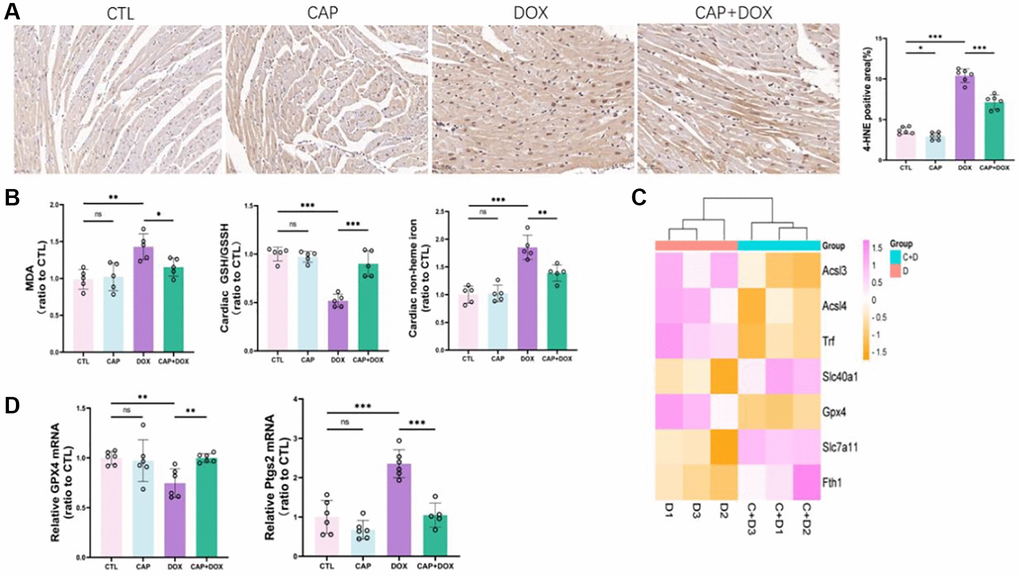 Drawing upon previous research findings, we hypothesized that CAP may provide a protective effect against DOX-induced cardiac ferroptosis. Our experimental validation supported this hypothesis. Additionally, our investigations demonstrated that CAP could inhibit DOX-induced myocardial apoptosis, as revealed by RNA-seq analysis. This study successfully identified and characterized the specific pathways involved in these two types of cell death during the experimental procedures.