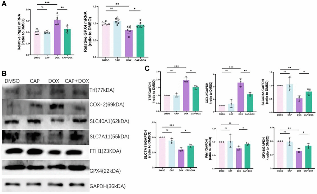 To demonstrate that CAP exerted the same effect in vitro, we performed an in vitro experiment using H9C2 cells [31]. Methods described in previous literature were used to treat H9C2 with DOX and CAP. Firstly, we conducted a CCK-8 cell viability assay and found that CAP significantly increased cell viability in the DOX group (Figure 5A). We then performed a lactate dehydrogenase (LDH) cytotoxicity assay (Figure 5B) and found that CAP also reduced DOX-induced cell toxicity. In order to detect the occurrence of ferroptosis, we first measured the ratio of reduced glutathione to oxidized glutathione in cells, and found that CAP up-regulated this ratio (Figure 5C). We then tested for intracellular reactive oxygen species and cell death, and found that the CAP+DOX group was lower than the DOX group as evidenced by ROS and PI staining (Figure 5D). Finally, we measured the mRNA and protein levels of ferroptosis-related genes. The CAP+DOX group was elevated in the expression of GPX4 mRNA compared to the DOX group, while PTGS2, which is induced by DOX, was significantly reduced by CAP (Figure 6A). Testing for GPX4, COX-2, and FTH1 protein levels revealed that GPX4 and FTH1 were higher in the CAP+DOX group than in the DOX group, whereas COX-2 decreased in the CAP+DOX group (Figure 6B, 6C). Meanwhile, we validated the effects of TRF and SLC40A1 on cellular iron intake by modulating their expression levels in vitro (Figure 6B, 6C). Our results indicate that CAP regulated intracellular iron pool, iron metabolism to inhibit dox-induced ferroptosis by up- or down-regulating the expression of TRF and SLC40A1.