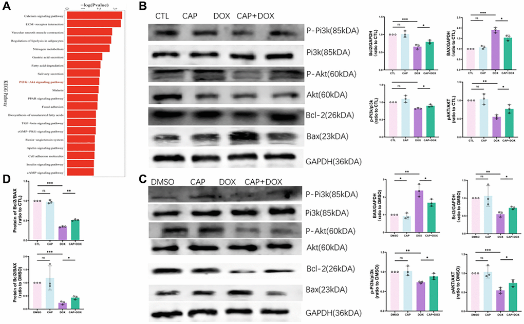 As mentioned earlier, ferroptosis plays an important role in DOX-induced myocardial disease; however, apoptosis, as a common form of cell death, also plays a key role in DOX-induced myocardial disease [29]. DOX induced cardiomyocyte apoptosis by suppressing the PI3K-Akt pathway and regulating BCL2 and BAX [10]. Through KEGG pathway enrichment analysis, we discovered that the calcium ion channel and PI3K-Akt pathway were significantly enriched (Figure 7A). Therefore, to investigate the effect of CAP on DOX-induced apoptosis, we measured the mRNA and protein levels of apoptosis-related factors and found that BCL2, which was inhibited by DOX, was elevated in the presence of CAP, while DOX-induced BAX was decreased (Figure 7B). The ratio of BCL2 to BAX could be used to determine the degree of myocardial apoptosis [32]; we found that CAP inhibited DOX-induced apoptosis (Figure 7D top). We then validated the phosphorylation levels of PI3K and Akt upstream and found that DOX reduced the phosphorylation levels of PI3K and Akt, whereas CAP+DOX restored the phosphorylation levels of PI3K and Akt. Therefore, we concluded that CAP alleviated DOX-induced apoptosis by upregulating the phosphorylation levels of PI3K and Akt. CAP inhibited DOX-induced myocardial apoptosis in mice, so we replicated similar experiments at the cellular level. Through our experiments, we found that CAP suppressed DOX-induced apoptosis in H9C2 cells. We also performed PI3K-Akt pathway validation in our cellular experiments and obtained similar results (Figure 7C). We then analyzed the relevant apoptosis-related proteins and found that BCL2, as an anti-apoptotic protein [33], was significantly upregulated by CAP when DOX inhibits this gene; on the other hand, BAX, as a pro-apoptotic protein [34], was inhibited by CAP (Figure 7C). And the ratio of BCL2 and BAX decreased, so we could tell the apoptosis was reduced by CAP (Figure 7D bottom). We have determined that CAP activated the PI3K-Akt pathway and reduced DOX-induced cellular apoptosis.
