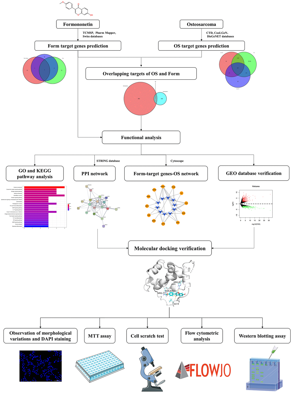 Therefore, we hypothesized that formononetin has some inhibitory effect on osteosarcoma and could serve as an effective anti-tumor therapeutic approach. Human osteosarcoma MG63 cells are a well-established osteoblastic cell line [26]. In this study, we used network pharmacology to study the anti-tumor activity of formononetin and determine its possible molecular mechanism in osteosarcoma treatment to provide a basis for further pharmacological action research and clinical application (Figure 1).