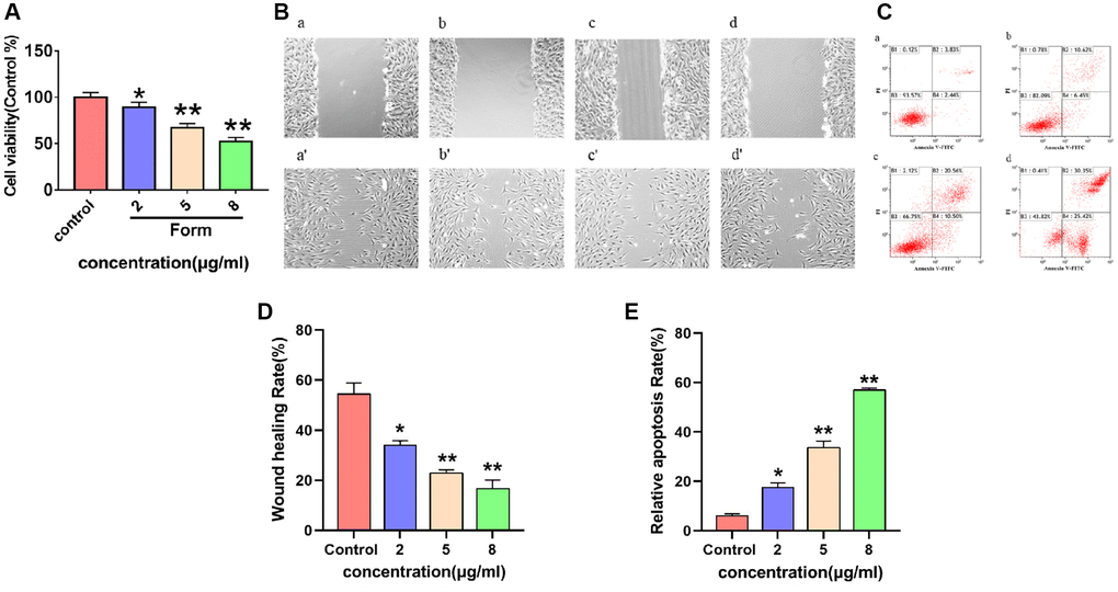 The effect of different concentrations of formononetin (0, 2, 5, and 8 μg/mL) on the migration ability of MG63 cells was analyzed using cell scratch test. As shown in Figure 10B (a, a′–d, d′) and 10D, the cell migration was significantly accelerated in the control group compared with the experimental groups after 48 h.