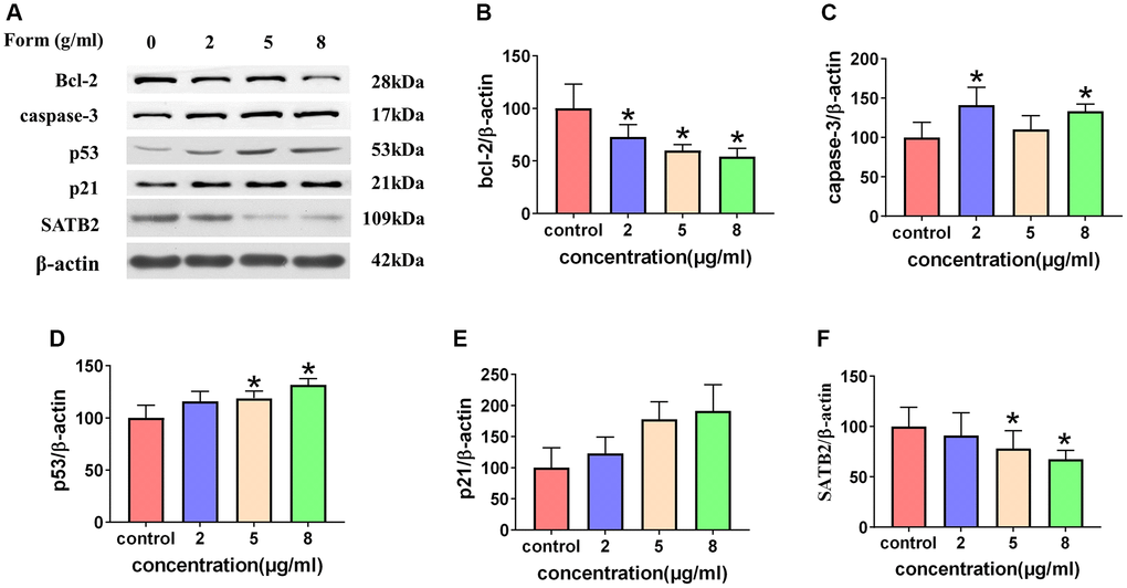 Cellular levels of bcl-2, caspase-3, p53, p21, and SATB2 protein in different concentrations of formononetin (0, 2, 5, and 8 μg/mL) were demonstrated in MG63 cells using a western blotting assay (Figure 11). Analysis of cell cultures incubated with various concentrations of formononetin for 48 h showed a decrease in gray ratios of bcl-2 with increasing concentrations of formononetin. Further, experimental groups had significantly lower gray ratios of bcl-2 than the control group. Expression levels of caspase-3, p53, and p21 in the experiment groups were higher than in the control group and increased concomitantly with formononetin concentrations. The cellular level of SATB2 protein in different concentrations of formononetin (0, 2, 5, 8 μg/mL) after 48 h treatment was suppressed in MG63 cells as shown through western blotting assay. The gray ratio of SATB2/β-actin of the experimental groups was significantly lower than that of the control group and decreased gradually as the drug dose was increased.