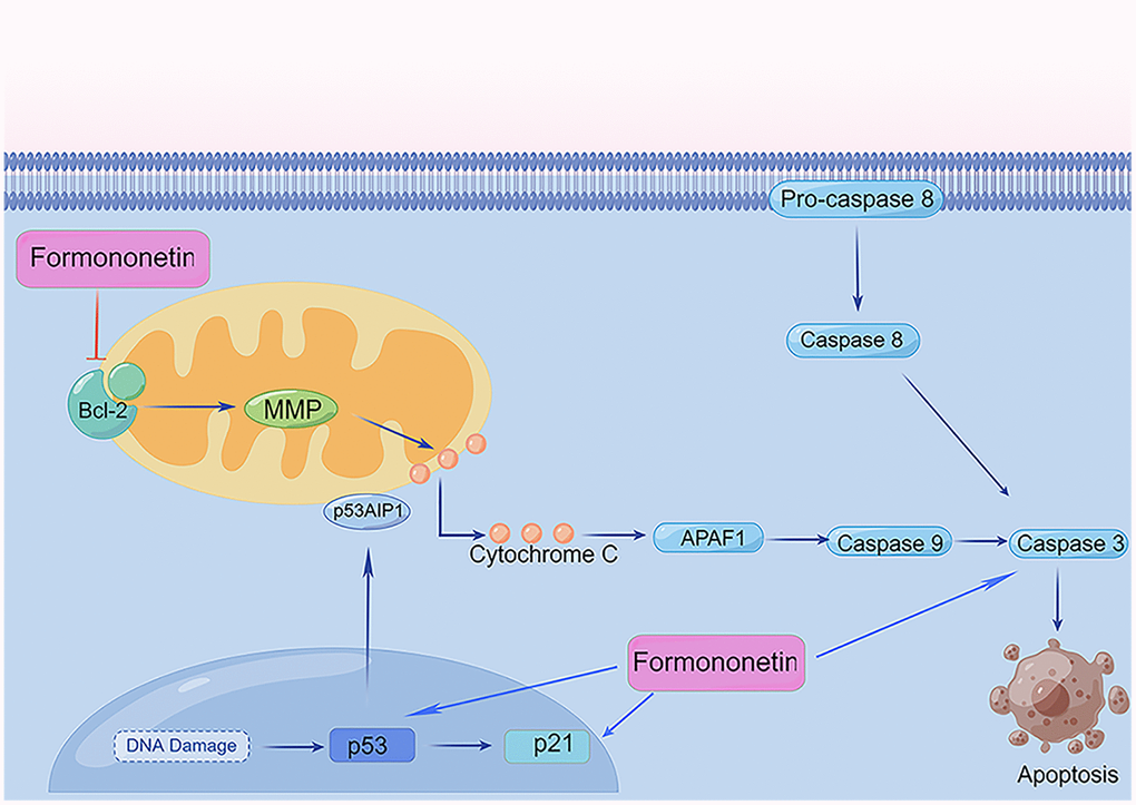 Multiple signal transduction pathways are involved in apoptosis, including the mitochondrial pathway that has been implicated apoptotic transduction in the organism. Mitochondria are the control center of vital cellular activities and regulate apoptosis of cells [45]. Bcl-2 is the upstream signaling molecule of caspase-3 regulating cell apoptosis. Within the caspase-protease family, caspase-3 is the promoter and inducer of apoptosis [46]. Once the apoptotic program has been initiated, caspase-3 is activated and then promotes apoptosis. Besides, p53 is a type of tumor suppressor protein strongly associated with the occurrence of tumors. P53 regulates the cell cycle and prevents cell carcinogenesis [47]. In contrast, p21 is a cyclin-dependent kinase inhibitor occurring downstream of p53. Research has shown that p21 is indirectly involved in apoptosis through the p53-dependent pathway [48]. In the present study, the mechanism of formononetin promoting apoptosis was studied by western blotting analysis. Our results revealed that expression of caspase-3, p21, and p53 were markedly up-regulated by formononetin. Meanwhile, bcl-2 expression indicated a formononetin concentrations-dependent decrease trend significantly. The findings indicated that formononetin could activate the bcl-2 signaling pathway. Therefore, our results support the effect of formononetin on the mitochondrial pathway in MG63 cells (Figure 12).